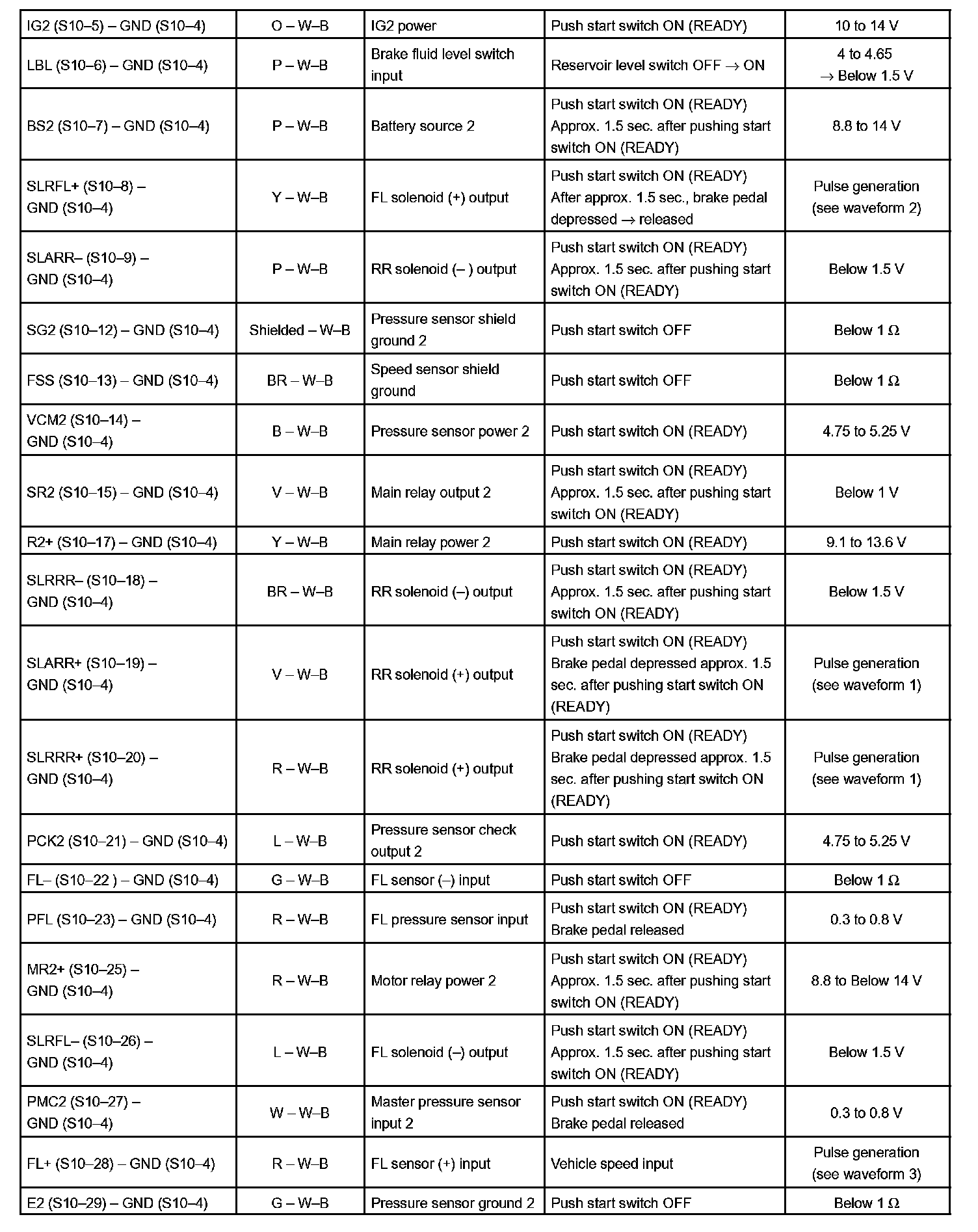 - Inspection should be performed from the back of the connector with the connector connected to the skid control ECU.