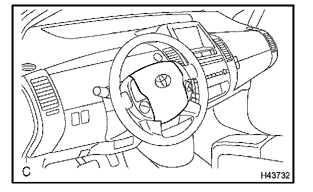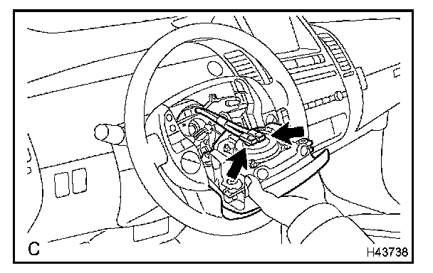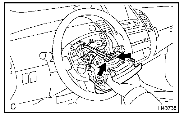 c. Pull out the horn button assy from the steering wheel assy and support the horn button assy with one hand as shown in the illustration.