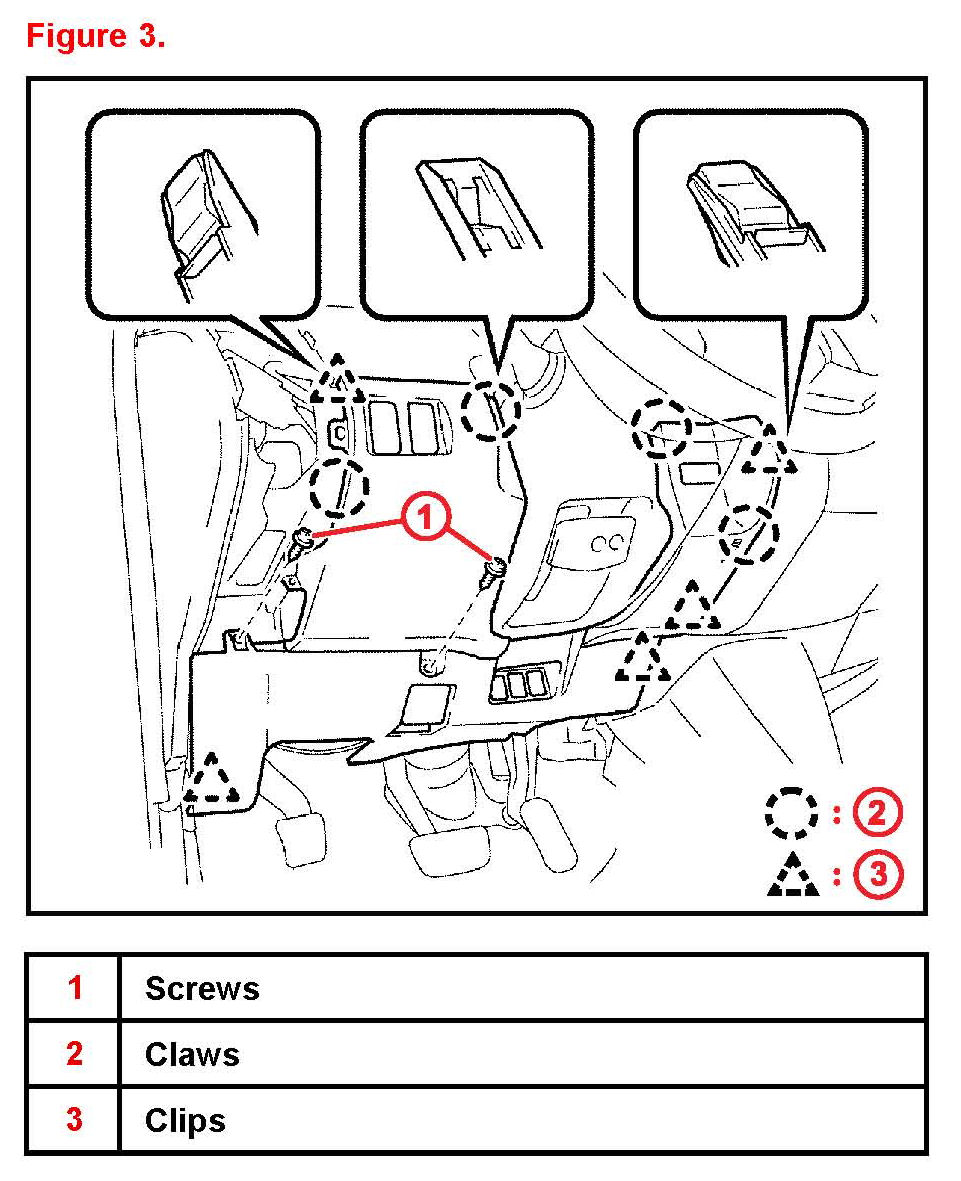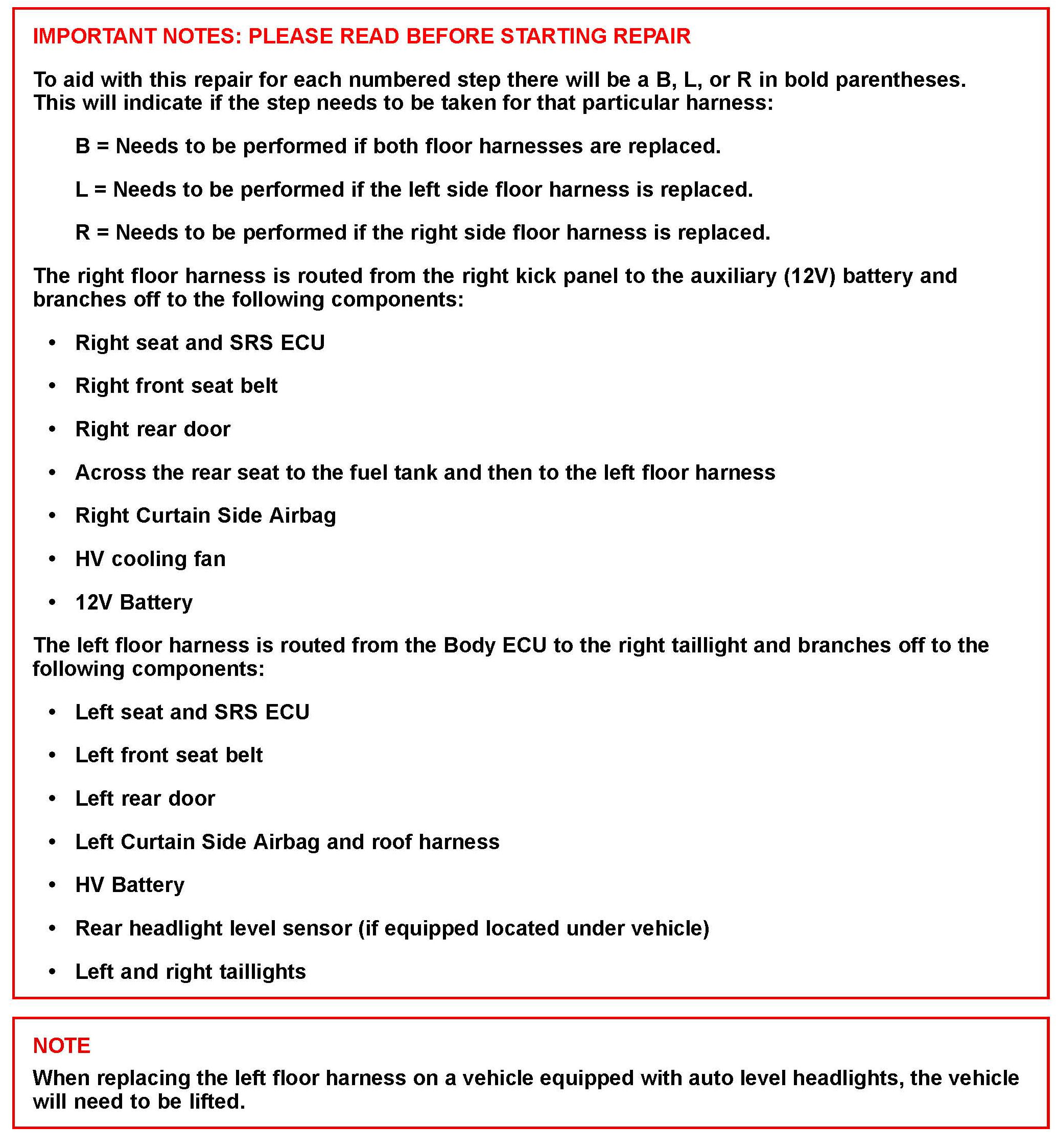After confirming the vehicle condition matches this bulletin this TSB will direct you to replace the floor wire harness. In order to do this it is necessary to first remove several major components such as the instrument panel front seats headliner and seat belts. This bulletin provides detailed instructions on the removal and installation of these components.