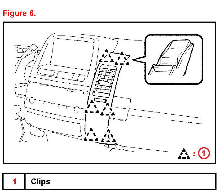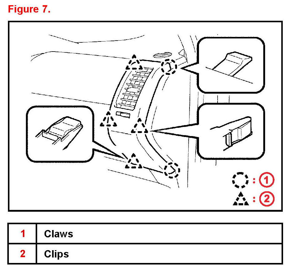 Detach the 2 claws and 4 clips and remove the instrument panel register.