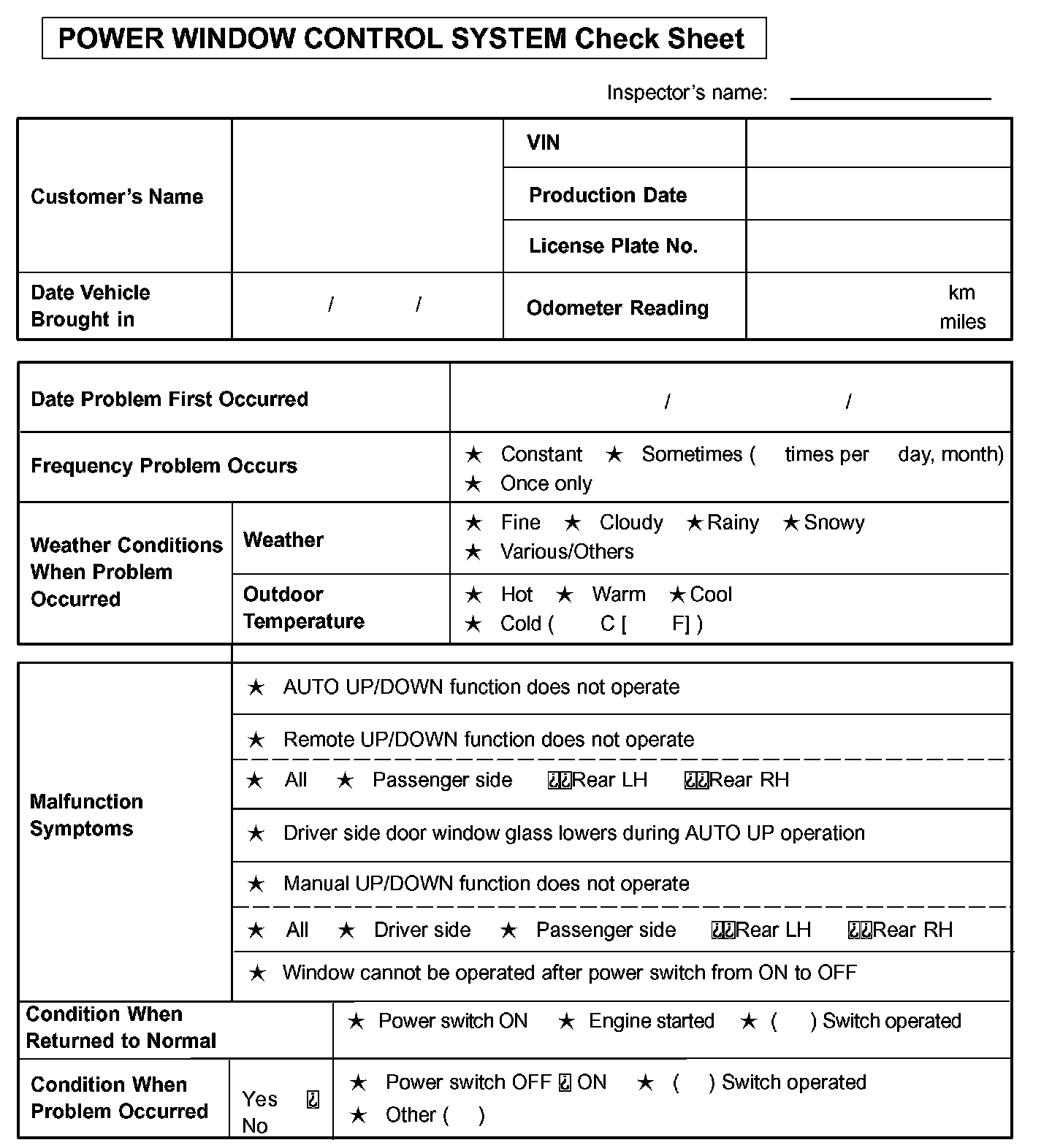 Power Window Control System Check Sheet: