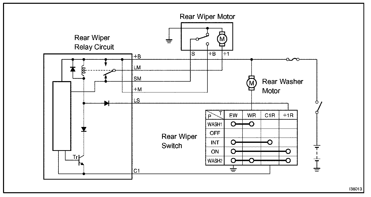 Even when the relay contact point turns off, current flows from terminal +B of the rear wiper motor, to the relay contact point in the rear wiper motor, to terminal S of the rear wiper motor, to terminal SM of the rear wiper relay, to the contact point of the rear wiper relay, to terminal LM of the rear wiper motor, to terminal +1 of the rear wiper motor and finally to ground until the rear wiper motor stops at the automatic stop position, causing the rear wiper motor to operate. Then the rear wiper motor stops at the automatic stop position as the relay contact point in the rear wiper motor turns off.