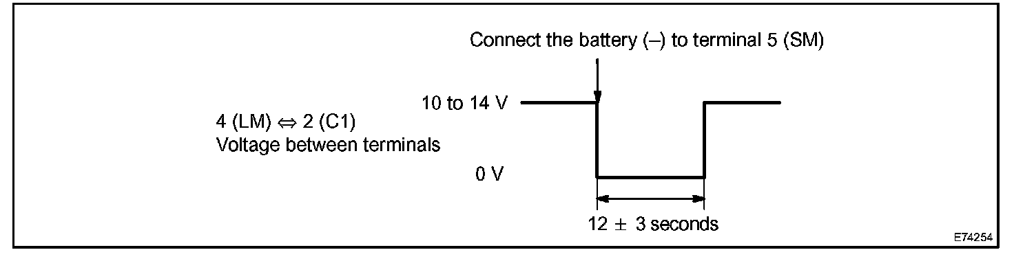 4. Connect the negative battery (-) lead to terminal 5 (SM) of the connector. Measure the voltage between terminals 4 (LM) and 2 (C1) when operating the intermittent wiper relay.