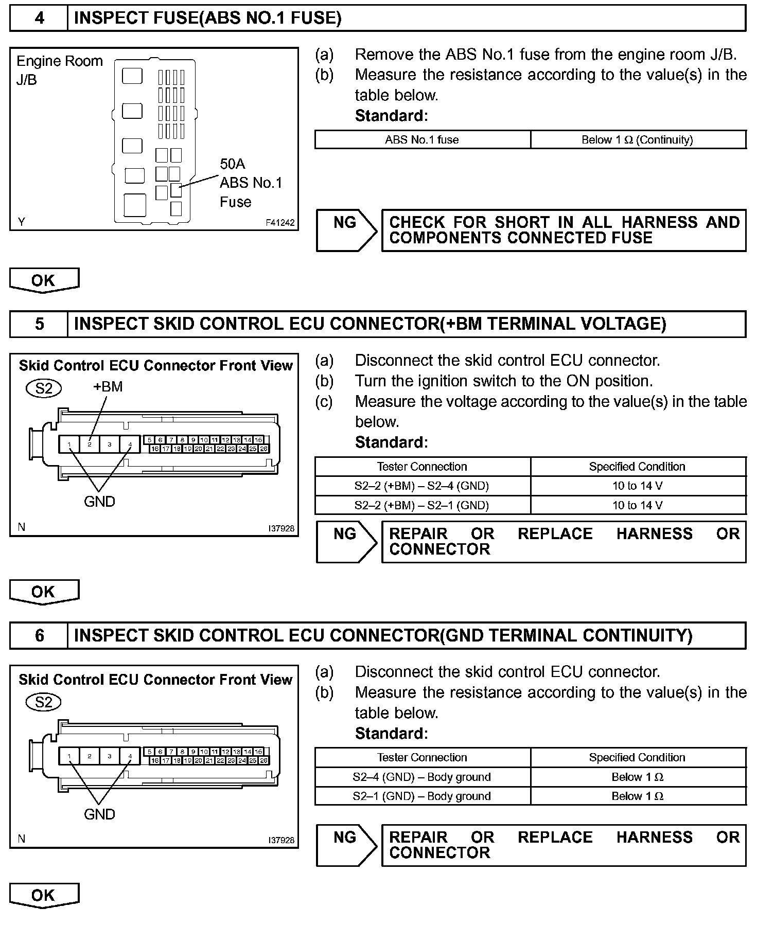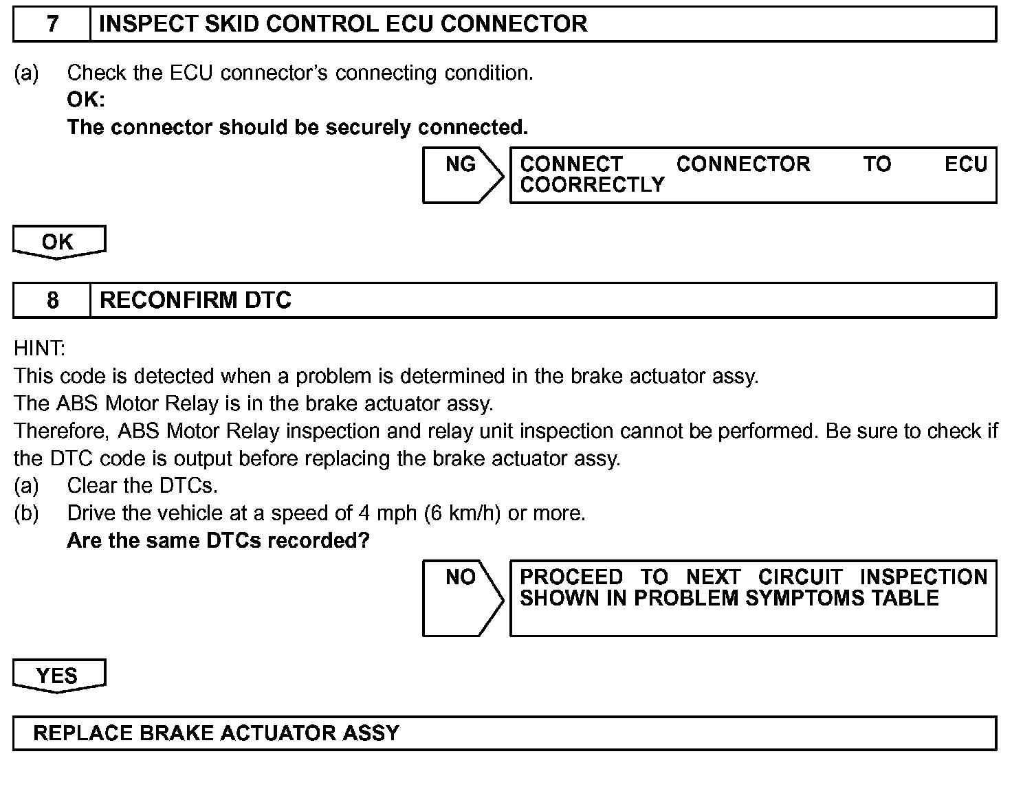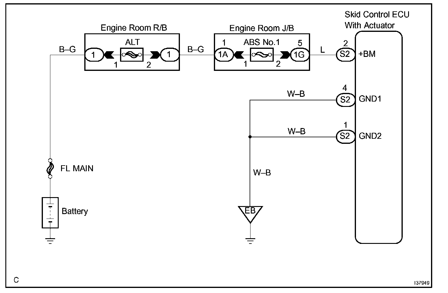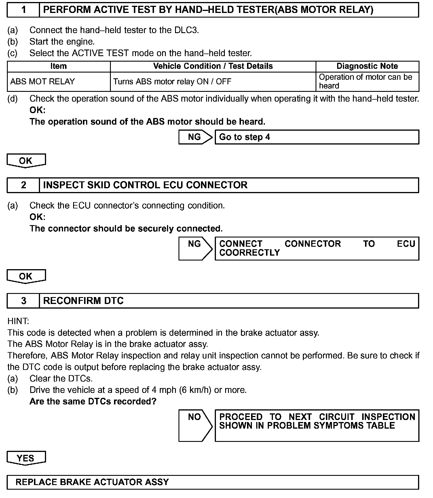 The ABS motor relay supplies power to the ABS pump motor. While the ABS is activated, the ECU switches the motor relay ON and operates the ABS pump motor.