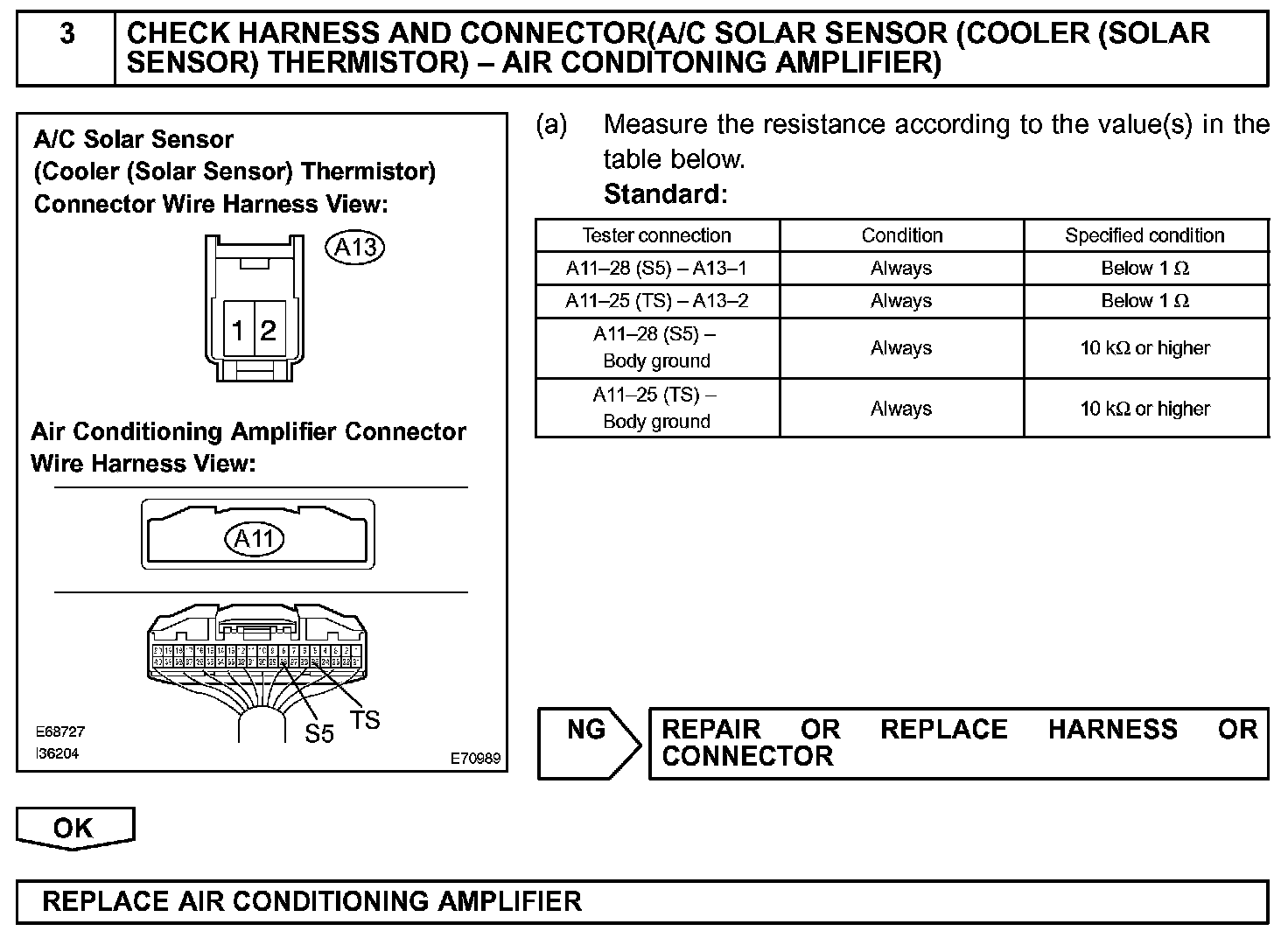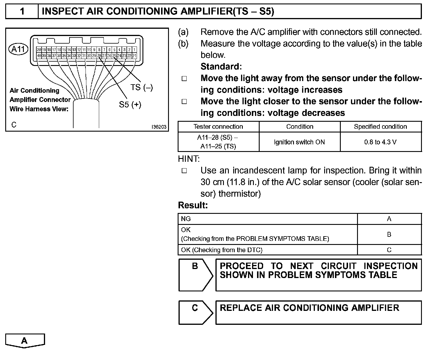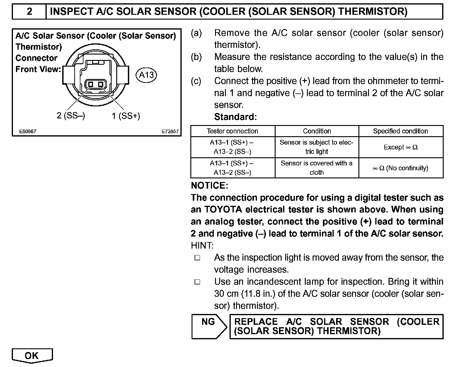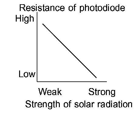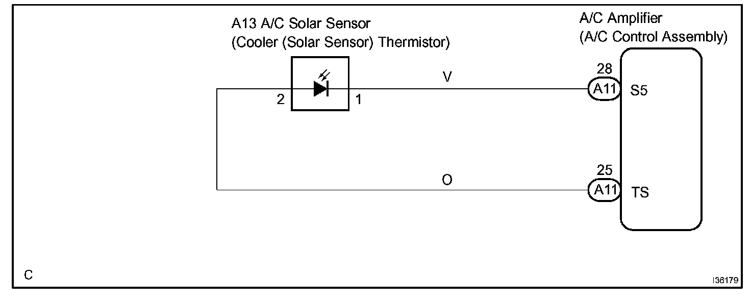 A photo diode in the A/C solar sensor (cooler (solar sensor) thermistor) detects solar radiation and sends signals to the A/C amplifier.