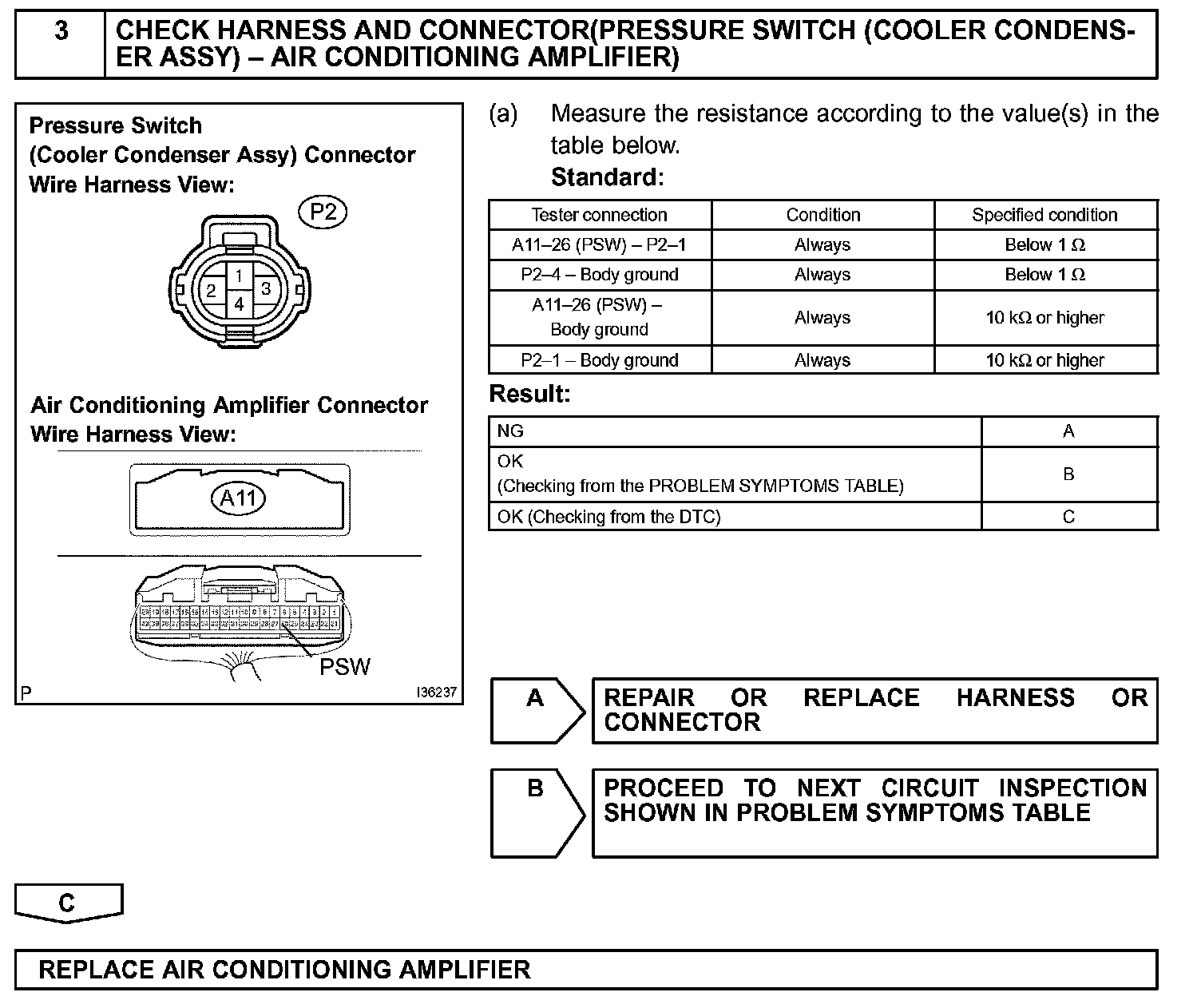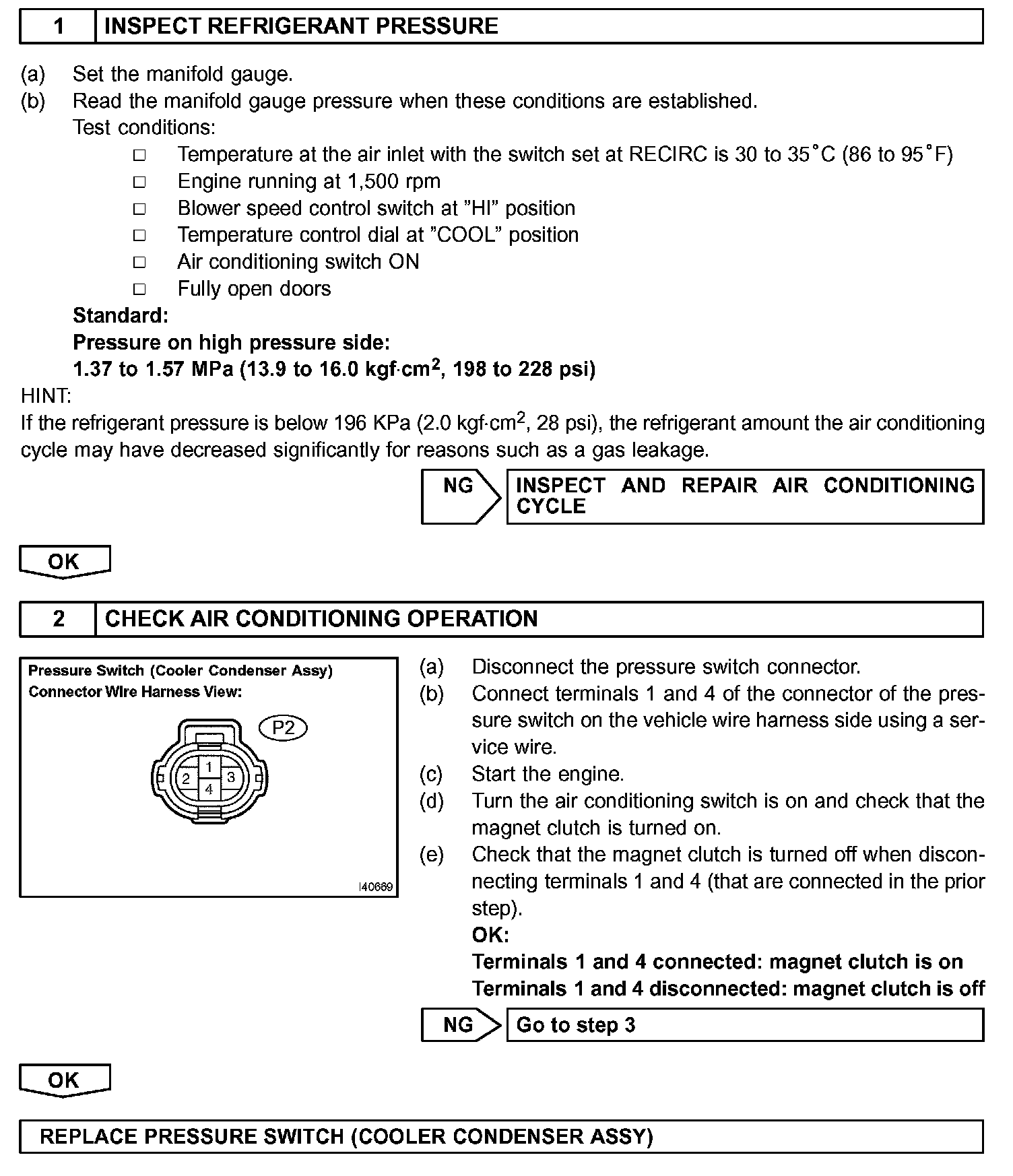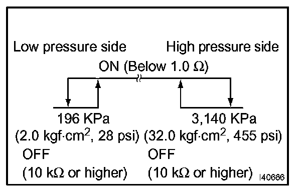 The pressure switch sends the appropriate signals to the A/C amplifier when the A/C refrigerant pressure drops too low or rises too high. When the A/C amplifier receives these signals, it outputs signals through the A/C amplifier to turn the magnet clutch relay off and turns the magnetic clutch off.