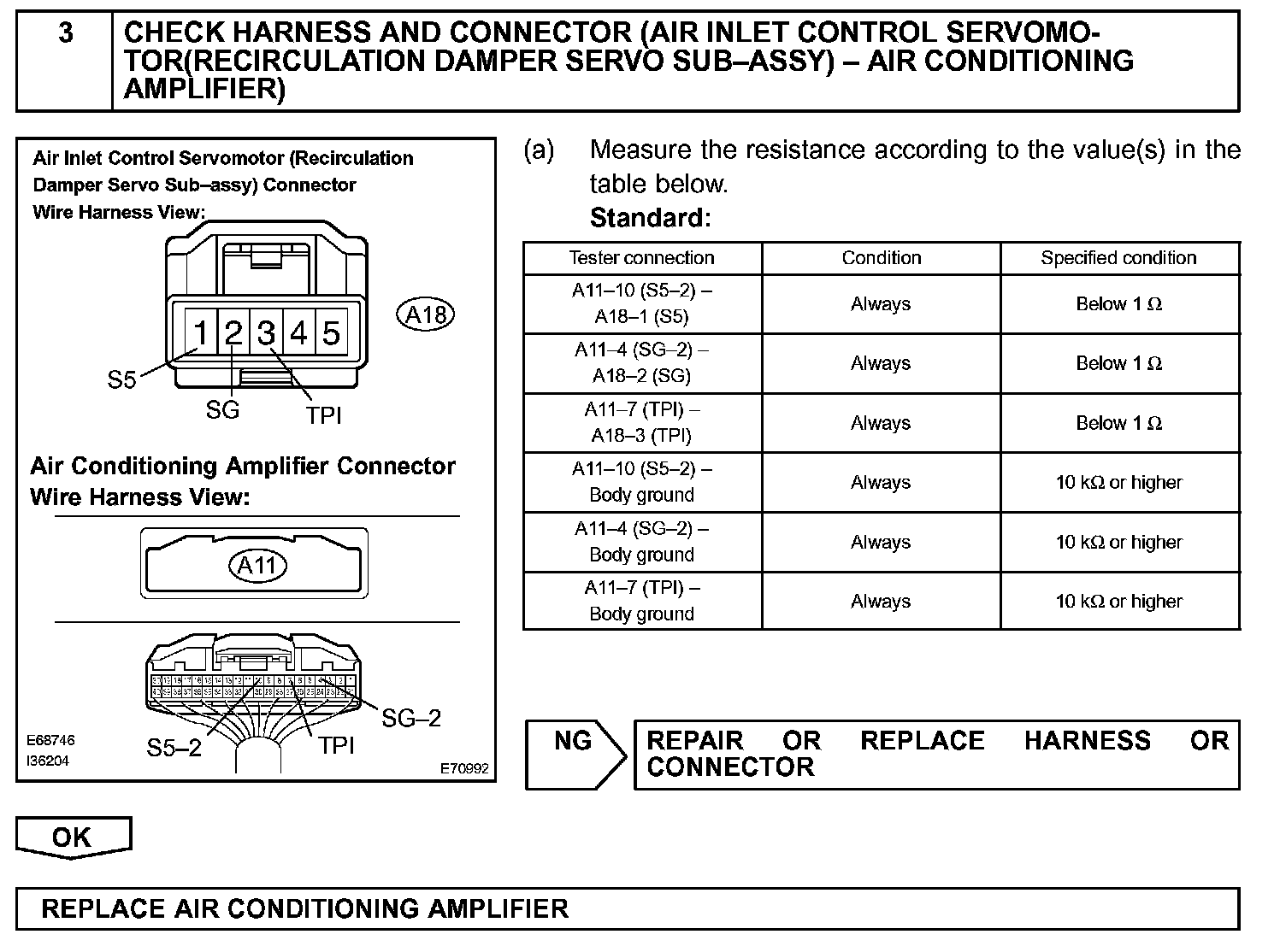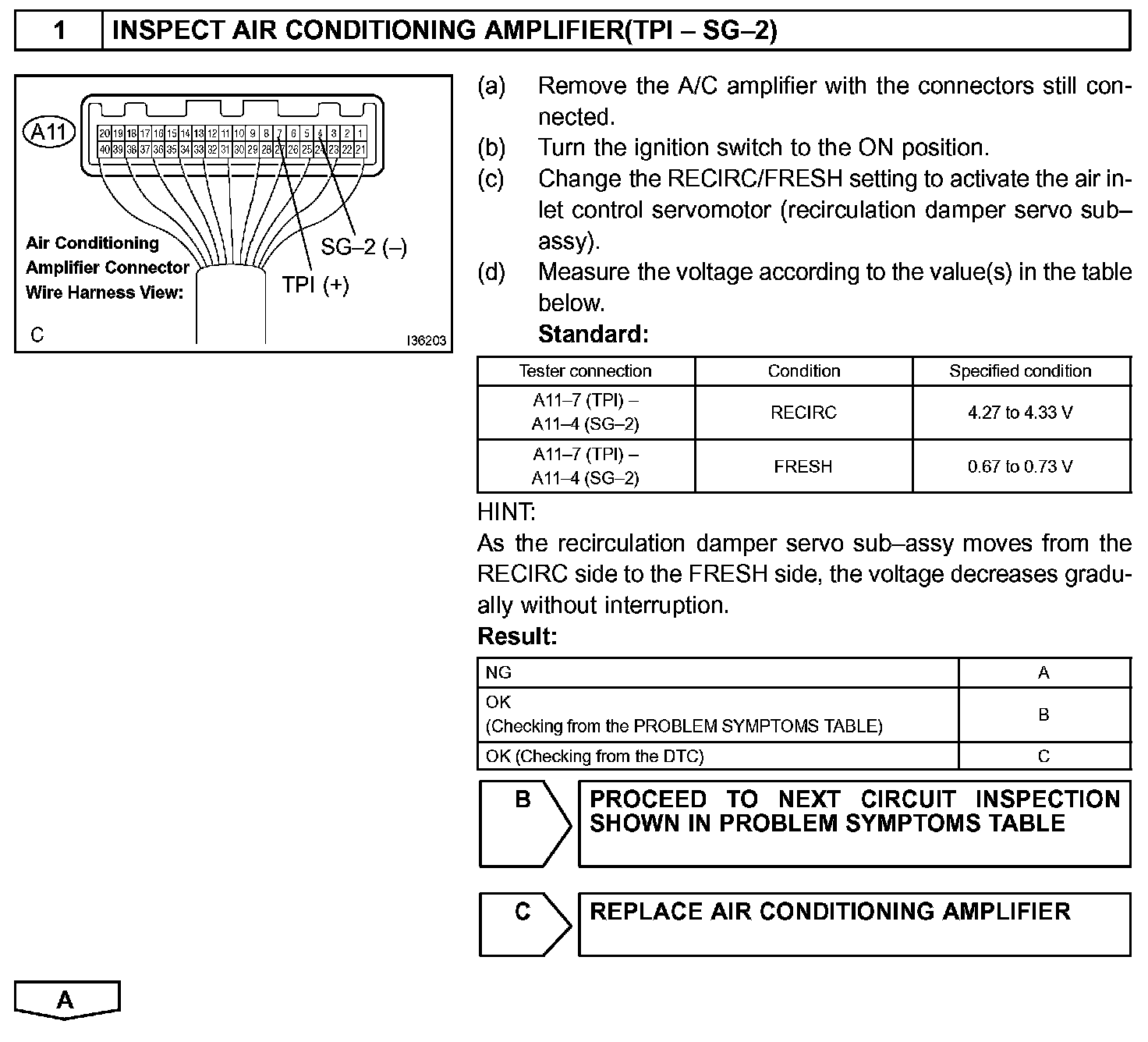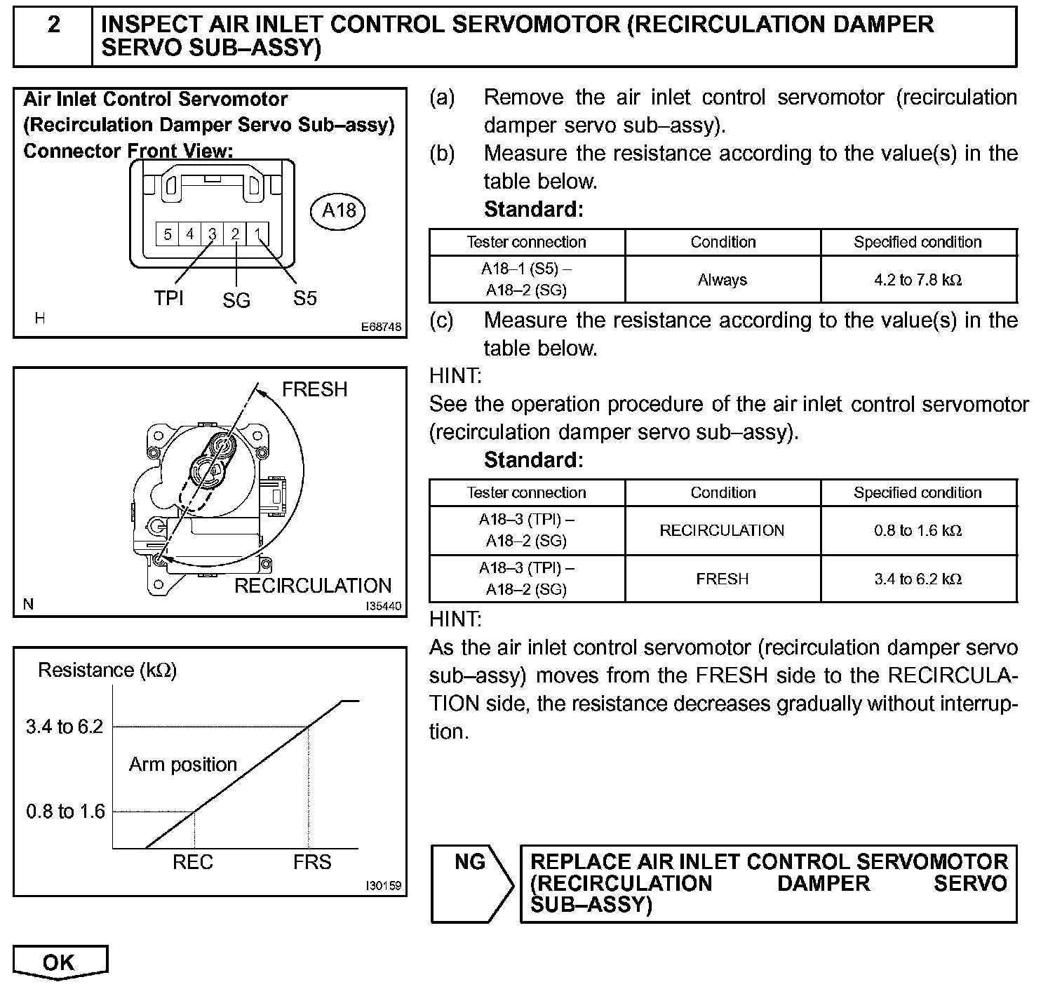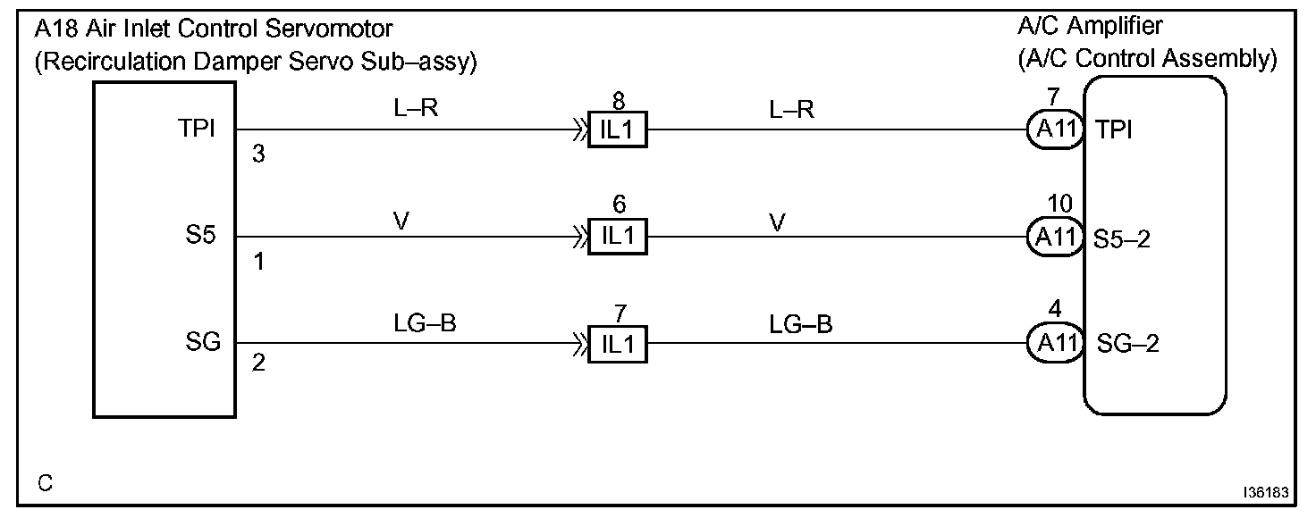This sensor detects the position of the air inlet control servomotor (recirculation damper servo sub-assy) and sends the appropriate signals to the A/C amplifier. The position sensor is built in the air inlet control servomotor (recirculation damper servo sub-assy).