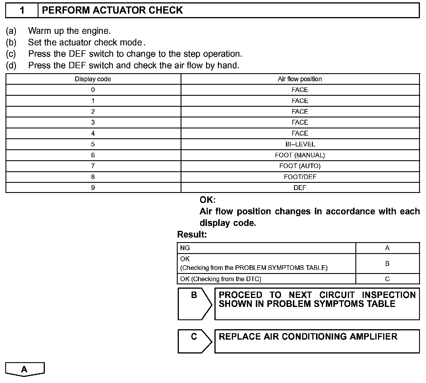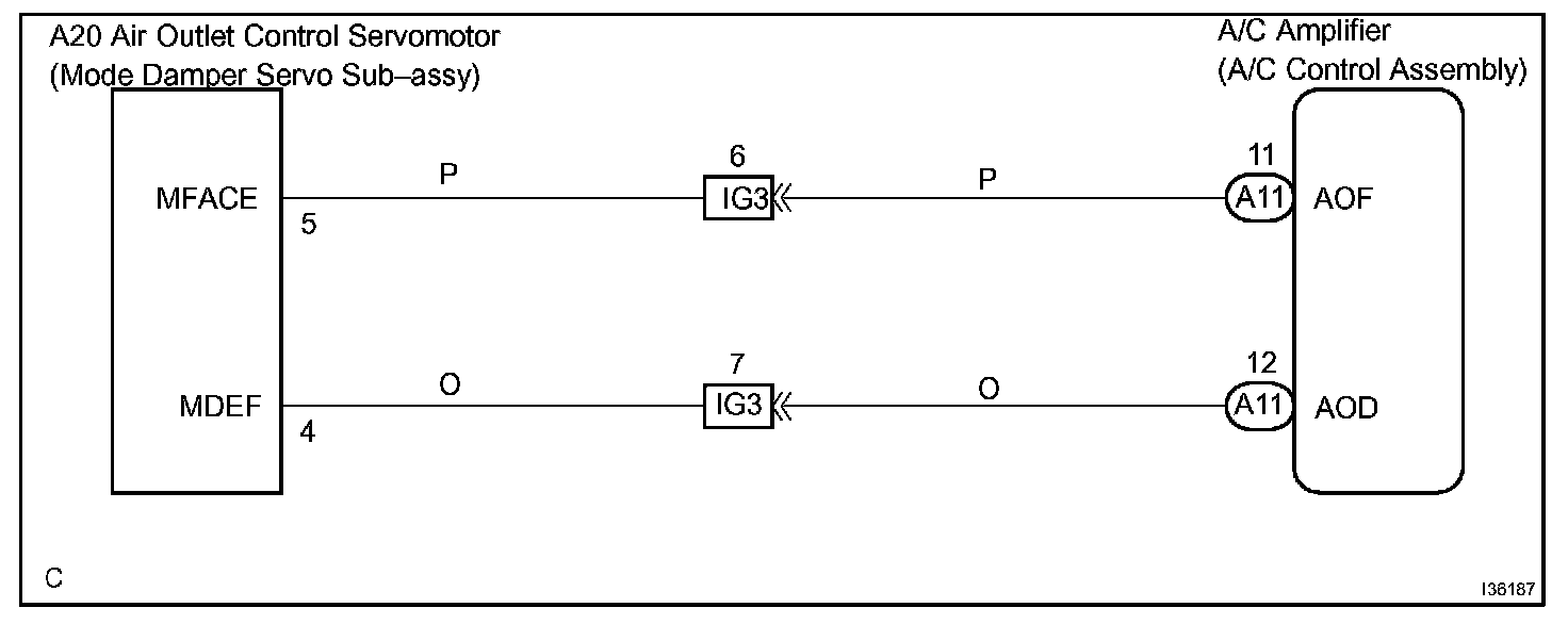 This circuit turns the servomotor and changes each damper position by receiving the signals from the A/C amplifier assy. When the AUTO switch is on, the A/C amplifier changes the mode between "FACE", "BI-LEVEL" and "FOOT" according to the temperature setting.