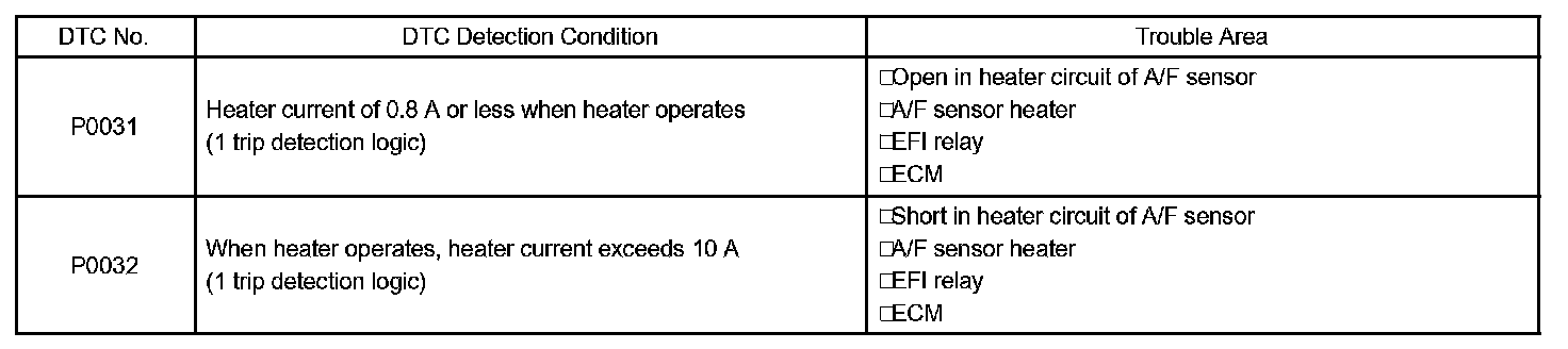 DTC P0032 OXYGEN (A/F) SENSOR HEATER CONTROL CIRCUIT HIGH (BANK 1 SENSOR 1)HINT: Although the title (DTC description) says "oxygen sensor", this DTC is related to the "A/F sensor".
