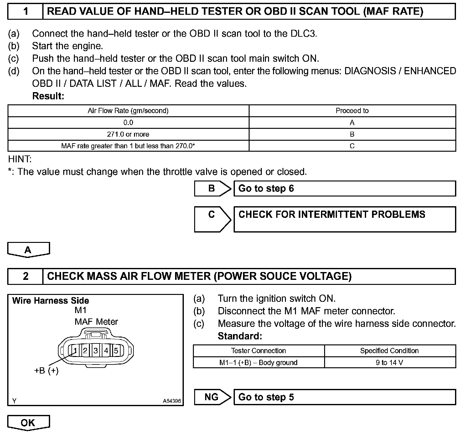 HINT: After confirming DTC P0100, P0102 or P0103, use the hand-held tester or the OBD II scan tool to confirm the MAF ratio from the ALL menu (to reach the ALL menu: DIAGNOSIS / ENHANCED OBD II / DATA LIST / ALL)