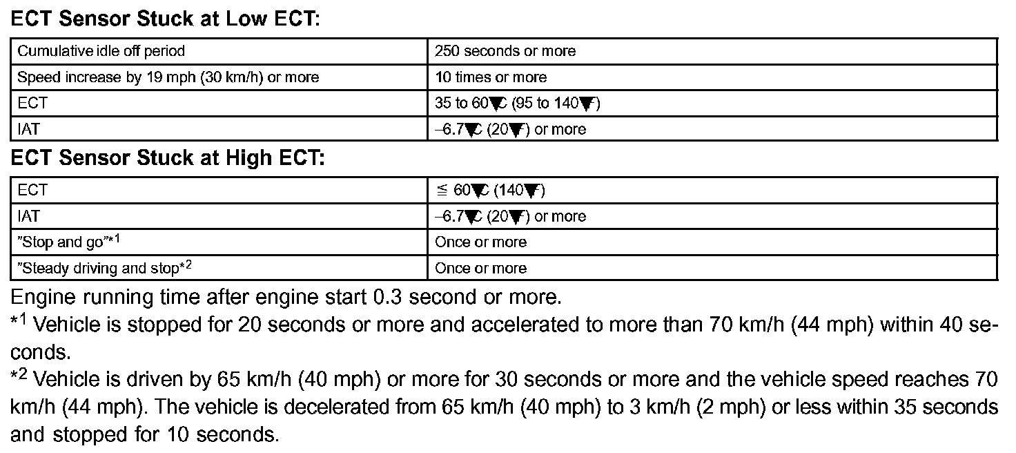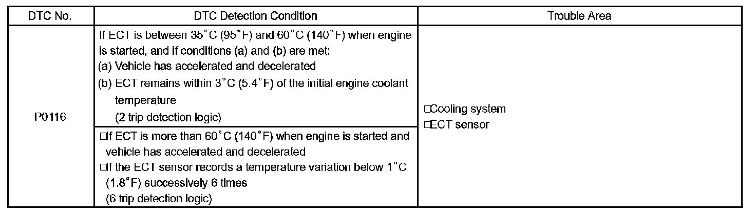 2. Upon starting the engine, the ECT is over 60°C (140°F). If, after driving for 250 seconds, the ECT still remains within 1°C (1.8°F) of the starting temperature, a DTC will be set (6 trip detection logic).