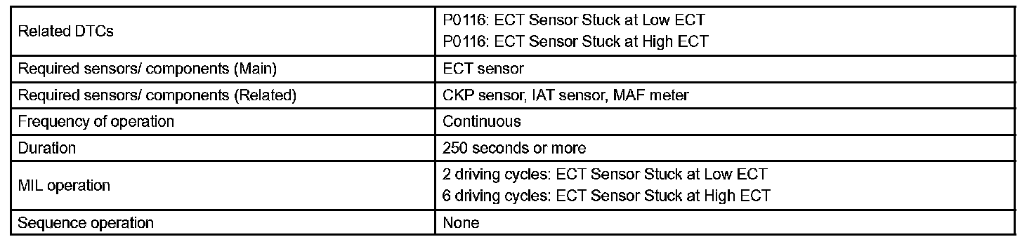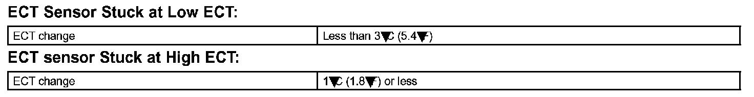 1. Upon starting the engine, the ECT is between 35°C (95°F) and 60°C (140°F). If, after driving for 250 seconds, the ECT still remains within 3°C (5.4°F) of the starting temperature, a DTC will be set (2 trip detection logic).