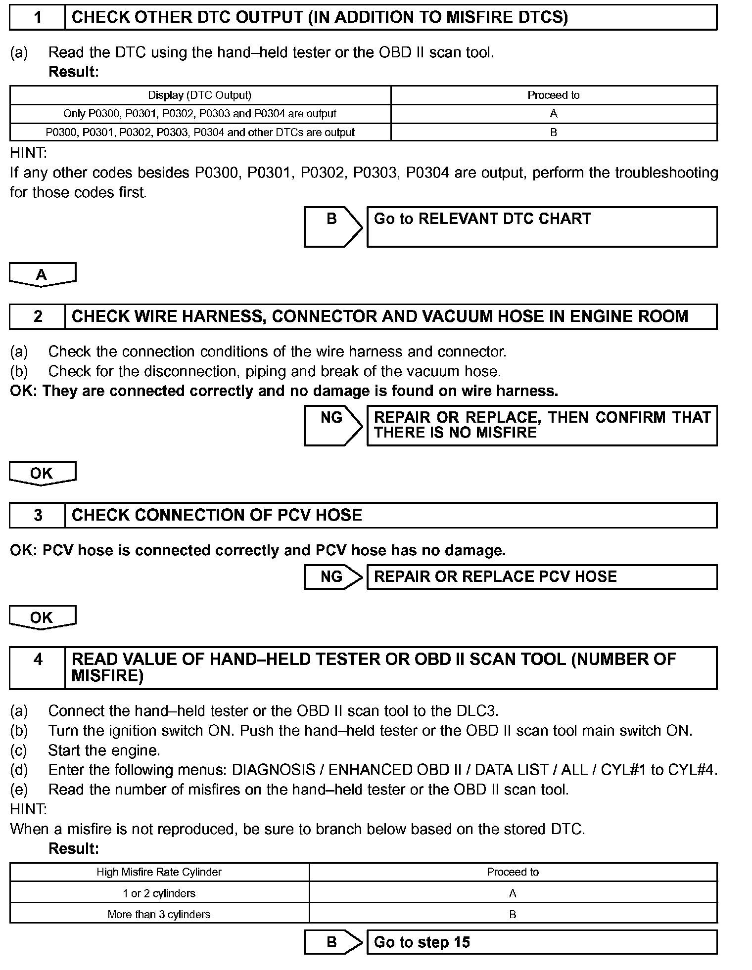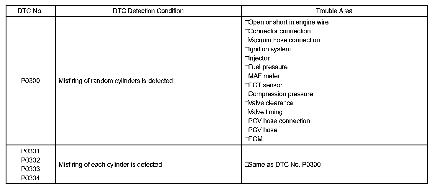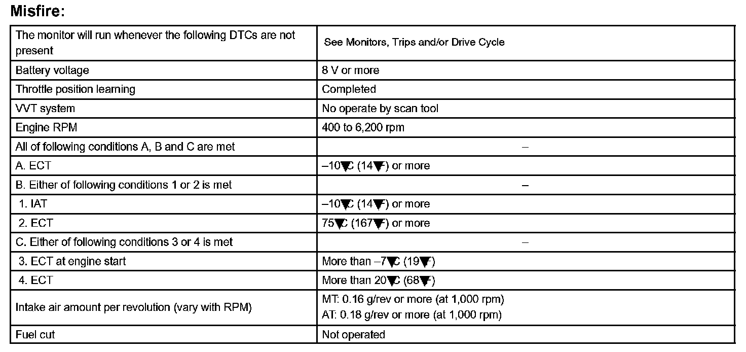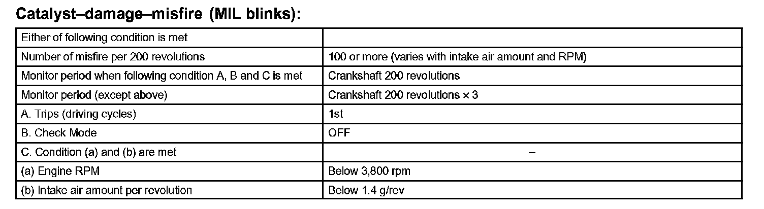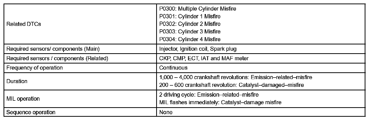 - After the first 1,000 engine revolutions after the engine starts, an excessive misfire rate (approximately 20 to 50 misfire per 1,000 engine revolutions) occurs 4 times.