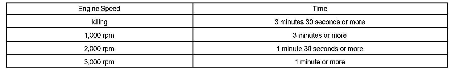 HINT: In order to memorize the misfire DTC, it is necessary to drive with MISFIRE RPM, MISFIRE LOAD in the DATA LIST for the period of time in the chart. Take care not to turn the ignition switch OFF. Turning the ignition switch OFF switches the diagnosis system from check mode to normal mode and all DTCs, freeze frame data and other data are erased.