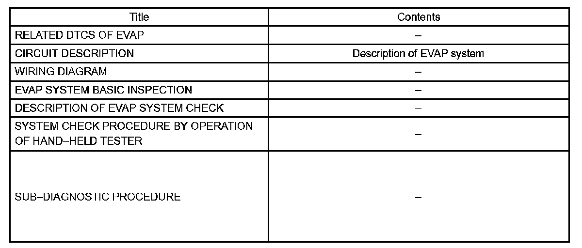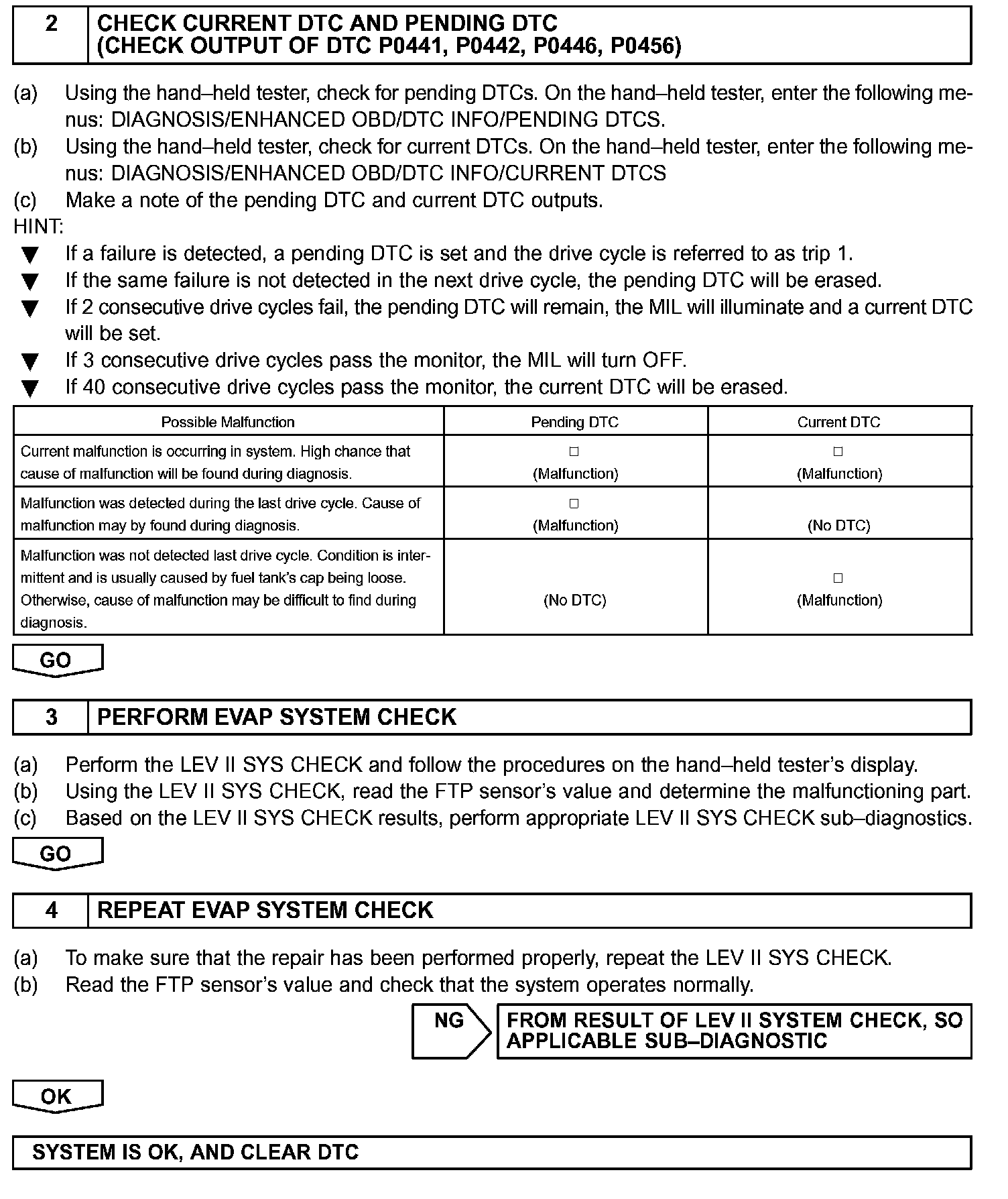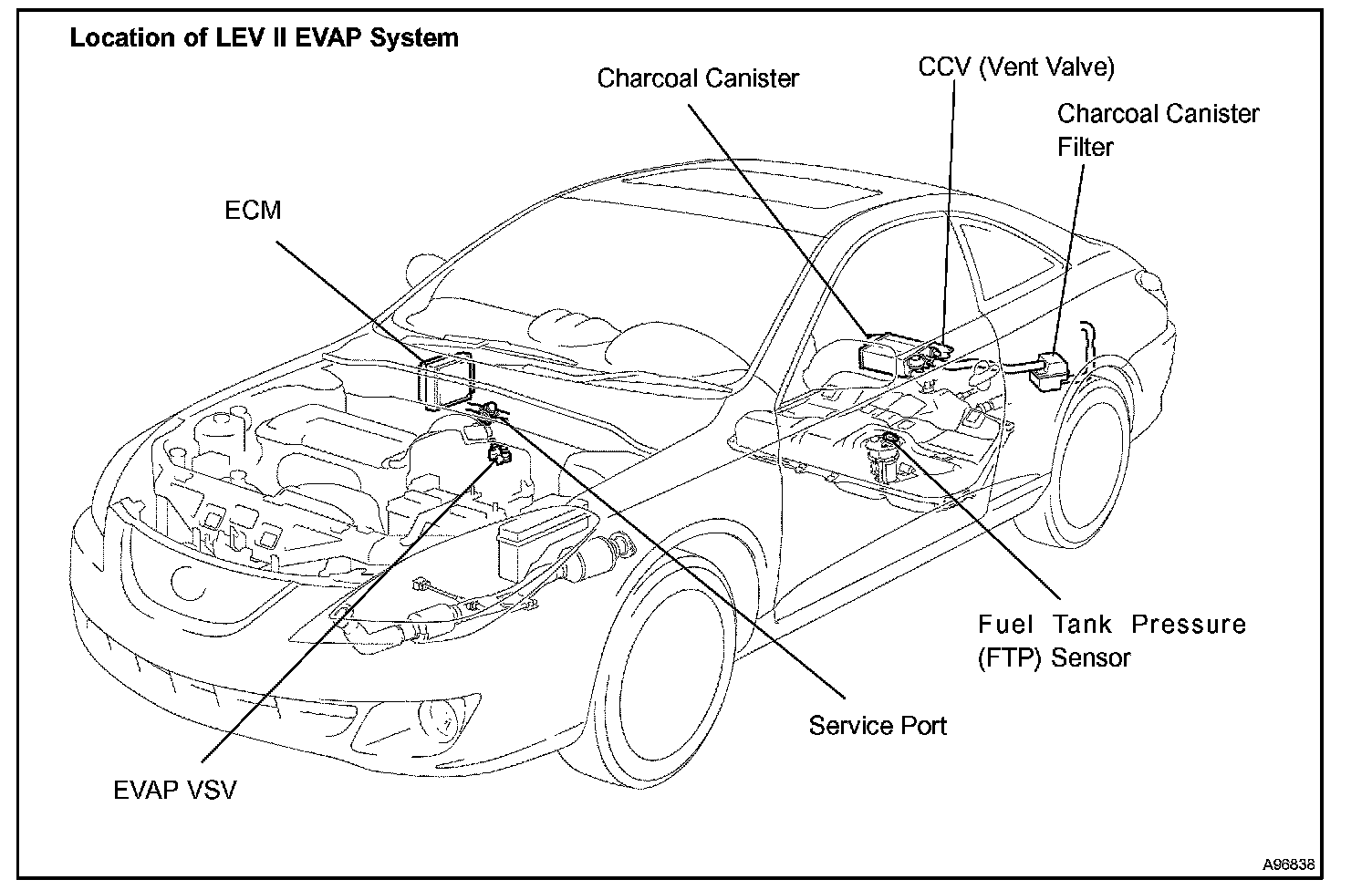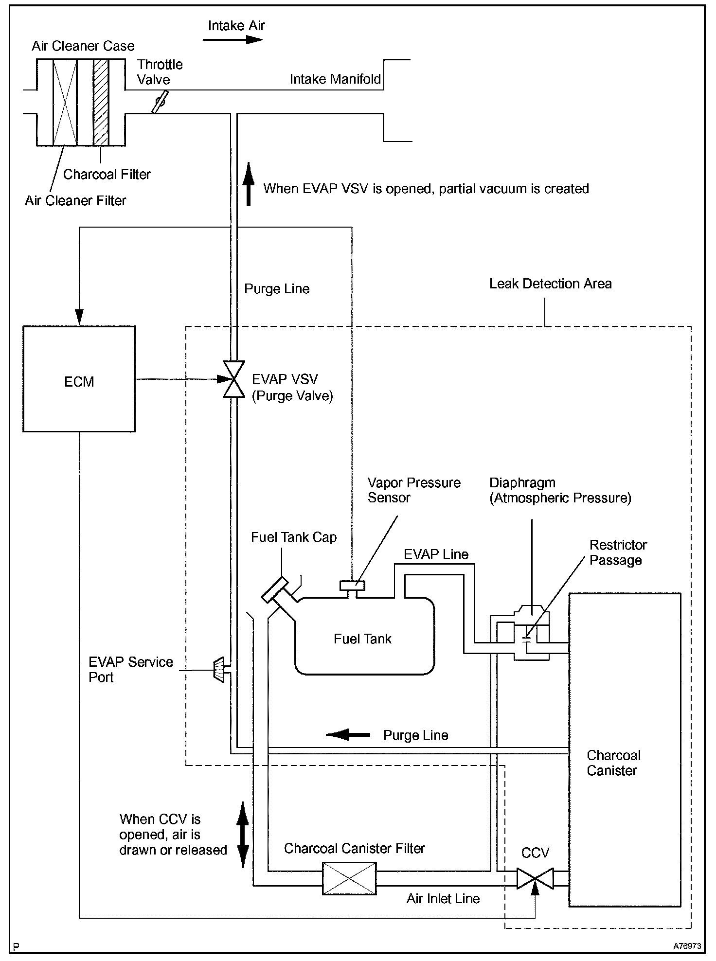 The ECM tests the Evaporative Emissions (EVAP) system using the fuel tank pressure sensor, Canister Close Valve (CCV), and EVAP VSV. The ECM closes the EVAP system and creates negative pressure (vacuum) into it. The ECM then monitors the internal pressure using the fuel tank pressure sensor.
