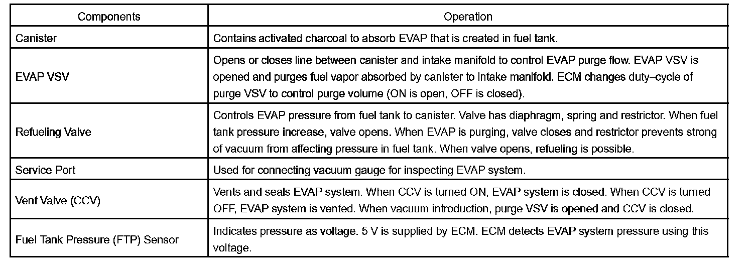 When predetermined conditions (closed loop, etc.) are met, the EVAP VSV is opened and stored fuel vapor in the canister is purged to the intake manifold. The ECM changes duty-cycle to the VSV to control purge flow volume. Purge flow volume is determined by the intake manifold pressure. Atmospheric pressure is allowed into the canister through the vent valve (CCV) to ensure that purge flow is maintained when negative pressure (vacuum) is applied to the canister.