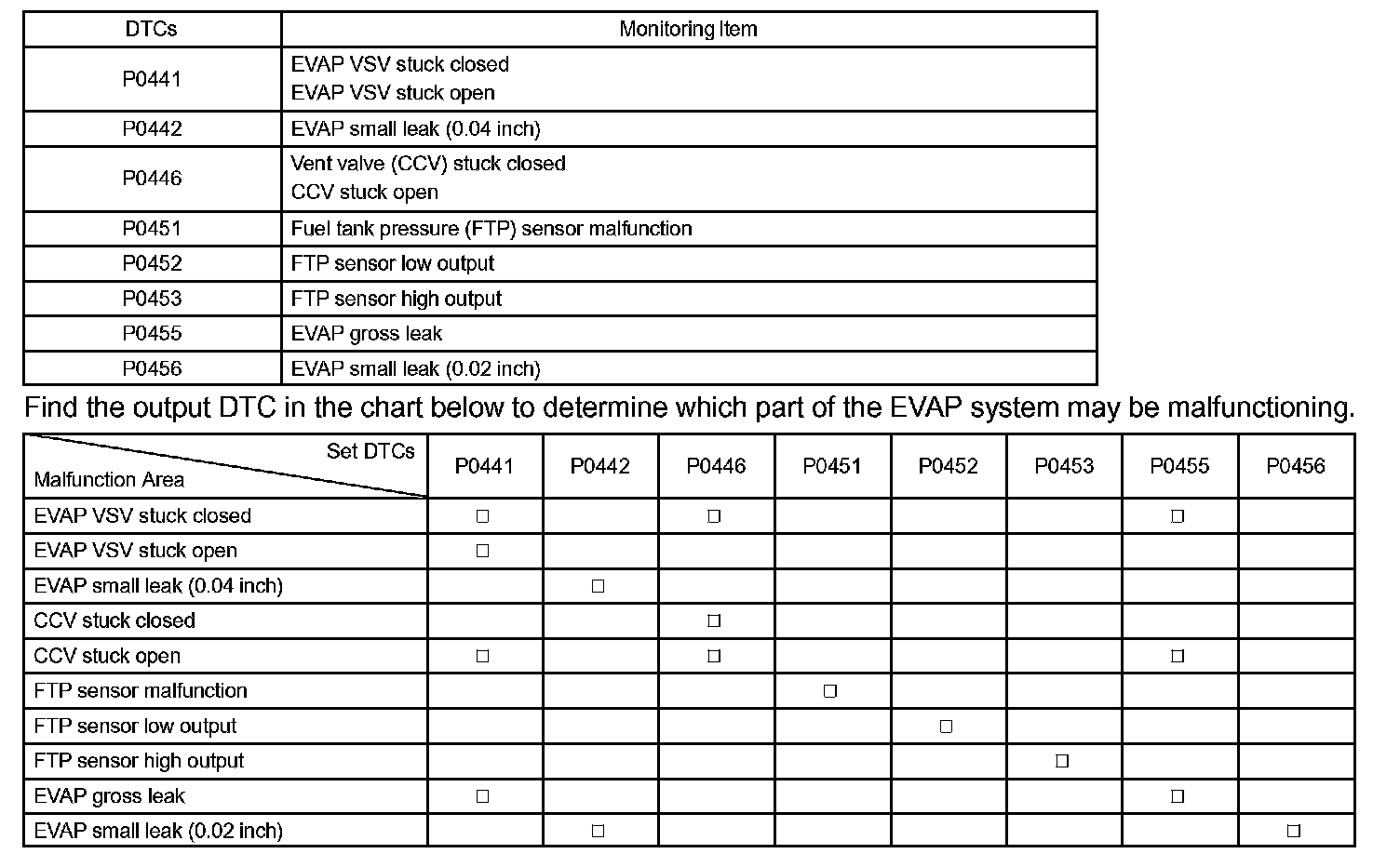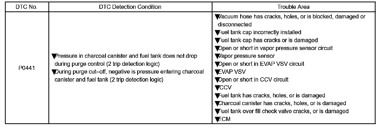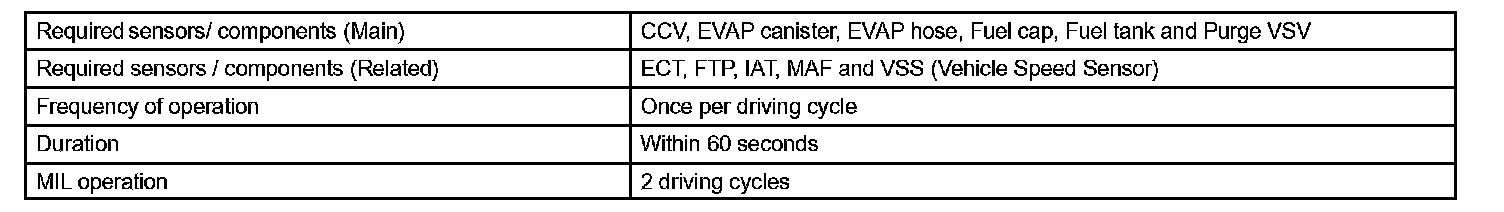 The ECM also has a method for checking if the CCV is "stuck open". The ECM commands the CCV to close while the EVAP VSV is open. If a sufficient amount of negative pressure does not develop in the fuel tank, the ECM determines that the CCV remains open despite the close command. The ECM would then turn on the MIL and output a DTC.