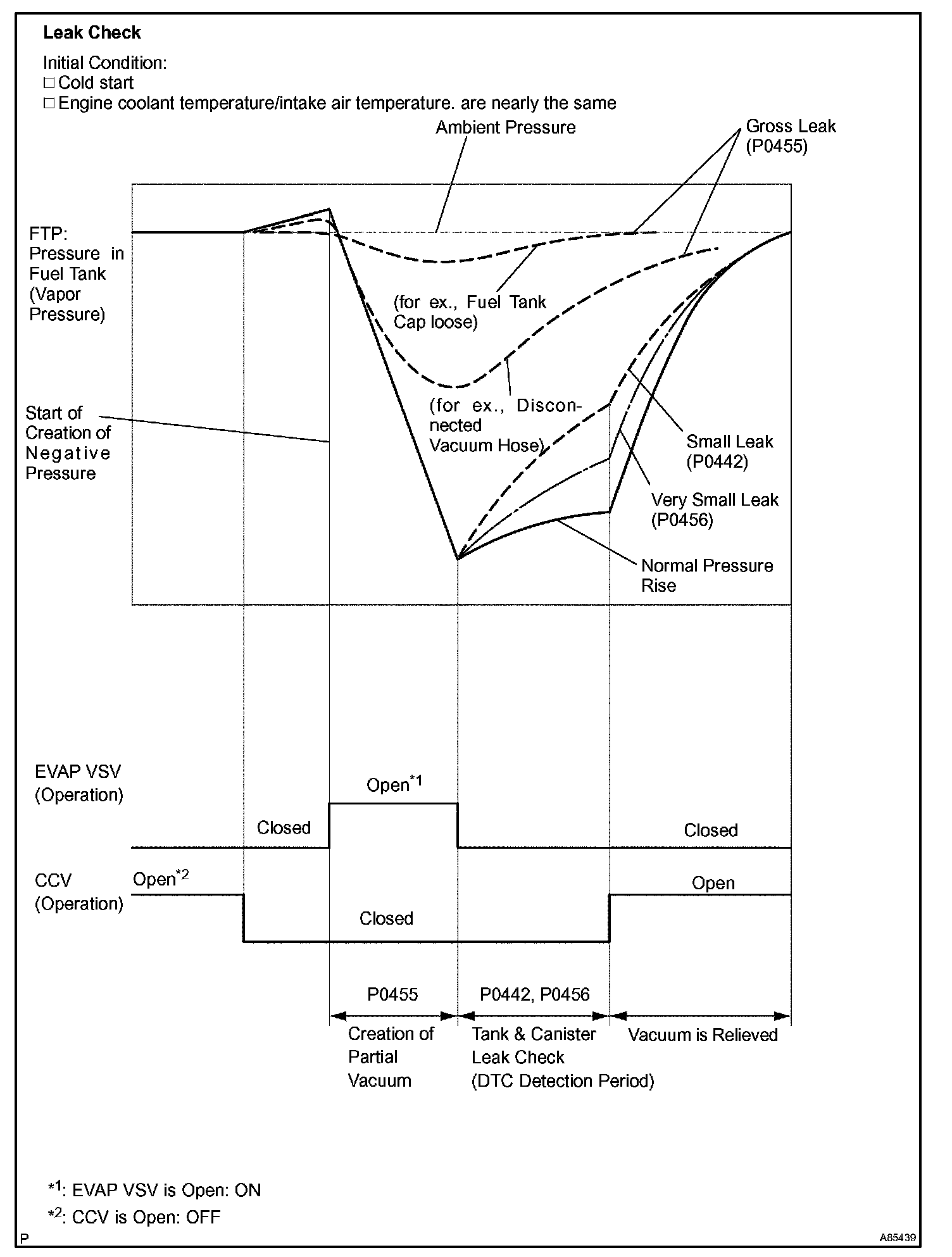 The ECM checks if the CCV is "stuck closed". The ECM commands the CCV to open while the EVAP VSV is open. If high negative pressure (vacuum) develops in the fuel tank and stays for more than 4 seconds, the ECM determines that the CCV remains closed despite the open command. The ECM would then turn on the MIL and output a DTC. The engine coolant temperature is not related to the output of this DTC.