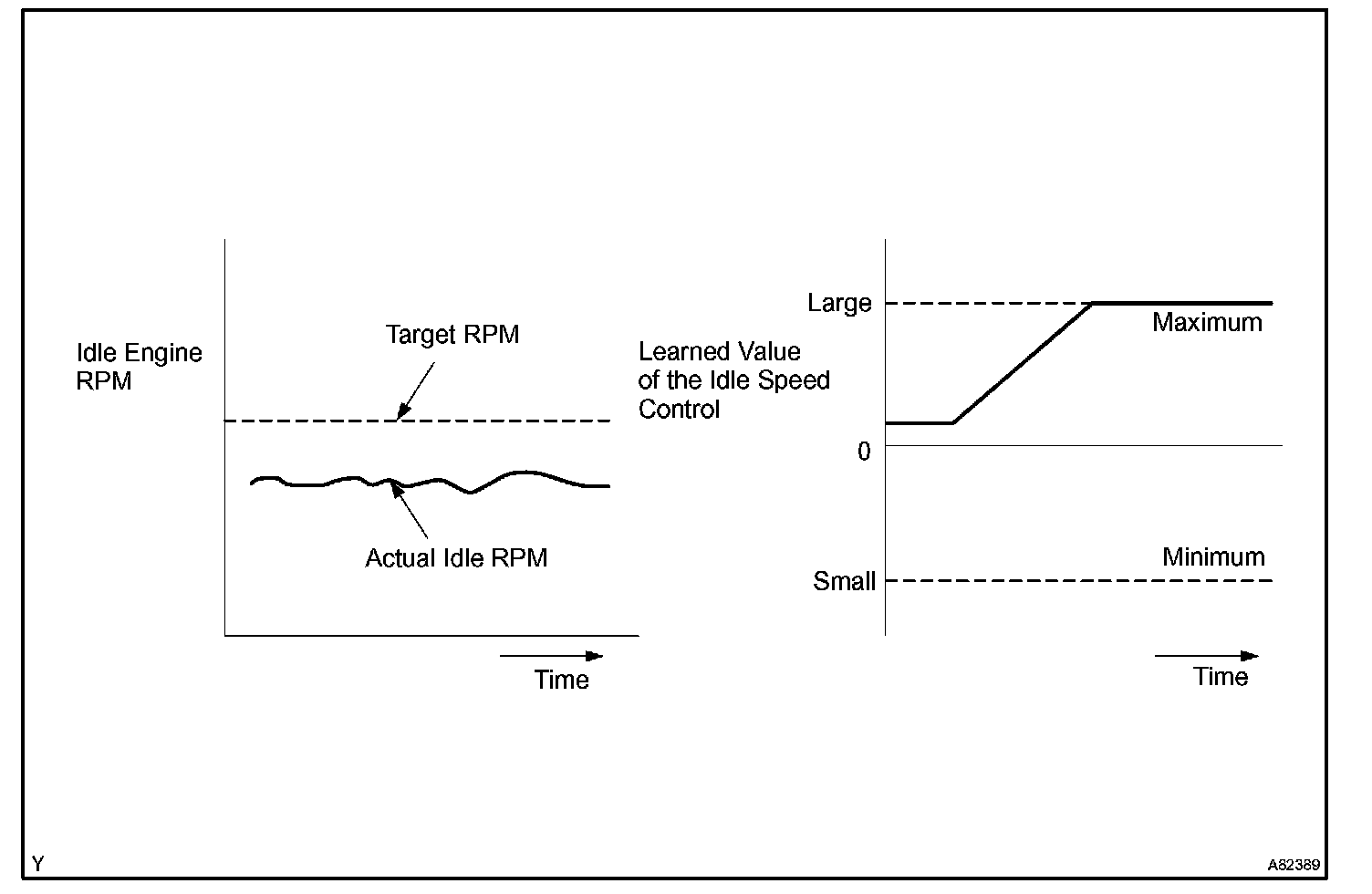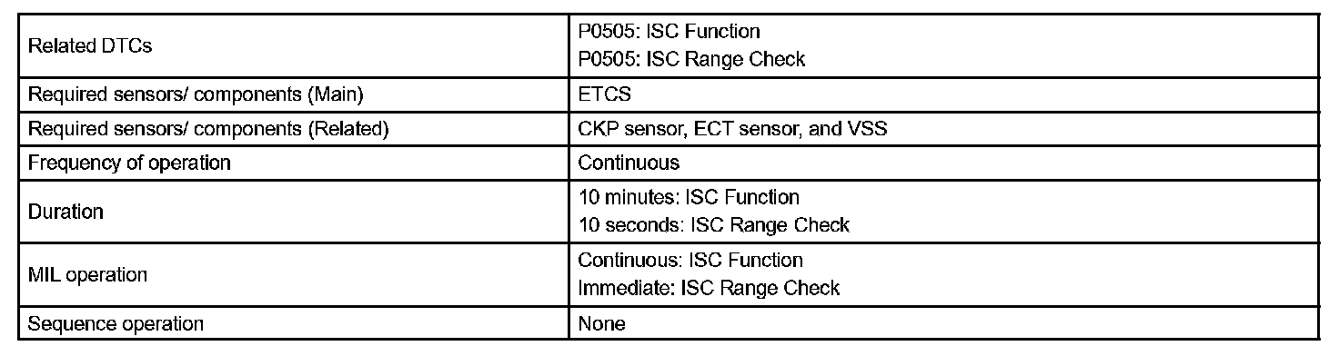 The ECM regulates the idle speed by opening and closing the throttle valve using the ETCS. The ECM concludes that the idle speed control ECM function is malfunctioning if: 1) the actual idle RPM varies more than the specified amount 5 times or more during a drive cycle, or 2) a learned value of the idle speed control remains at the maximum or minimum 5 times or more during a drive cycle. The ECM will turn on the MIL and set a DTC.