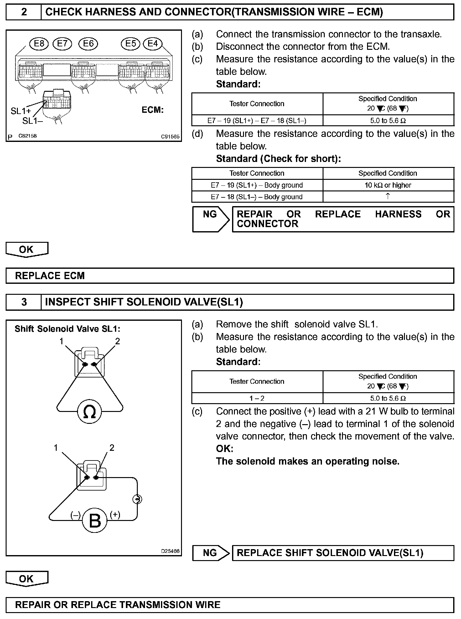Shifting from 1st to O/D is performed in combination with "ON" and "OFF" operation of the shift solenoid valves SL1 and SL2 which is controlled by the ECM. If an open or short circuit occurs in either of the shift solenoid valves, the ECM controls the remaining normal shift solenoid valve to allow the vehicle to be operated smoothly (Fail safe function).