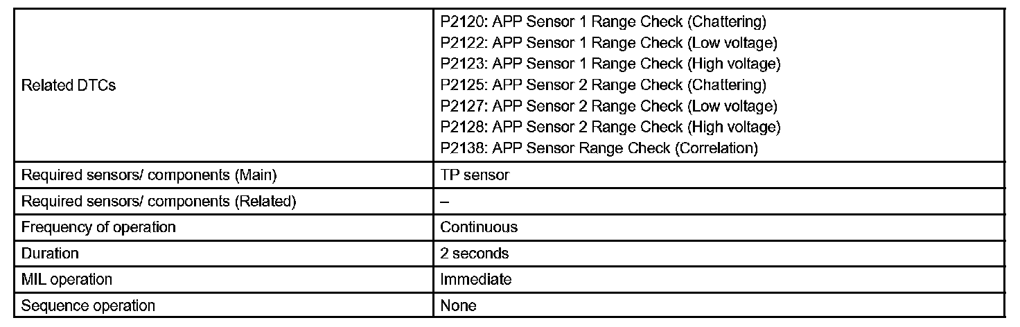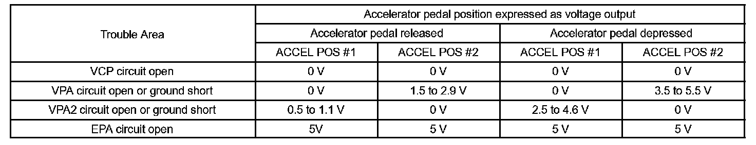 When VPA or VPA2 deviates from the standard, or the difference between the voltage outputs of the 2 sensors is less than threshold, the ECM concludes that there is a defect in the accelerator pedal position sensor. The ECM turns on the MIL and a DTC is set.