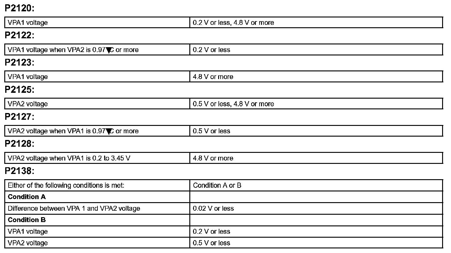 When the voltage output of the VPA is below 0.2 V or exceeds 4.8 V.