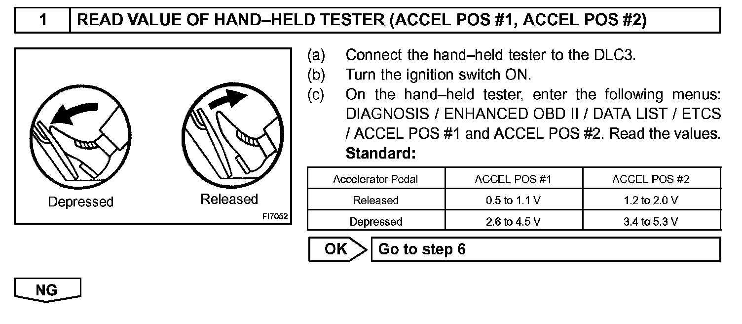 HINT: After confirming DTCs P2120, P2122, P2123, P2125, P2127, P2128 and P2138, use the hand-held tester or the OBD II scan tool to confirm the accelerator pedal position sensor output voltage.