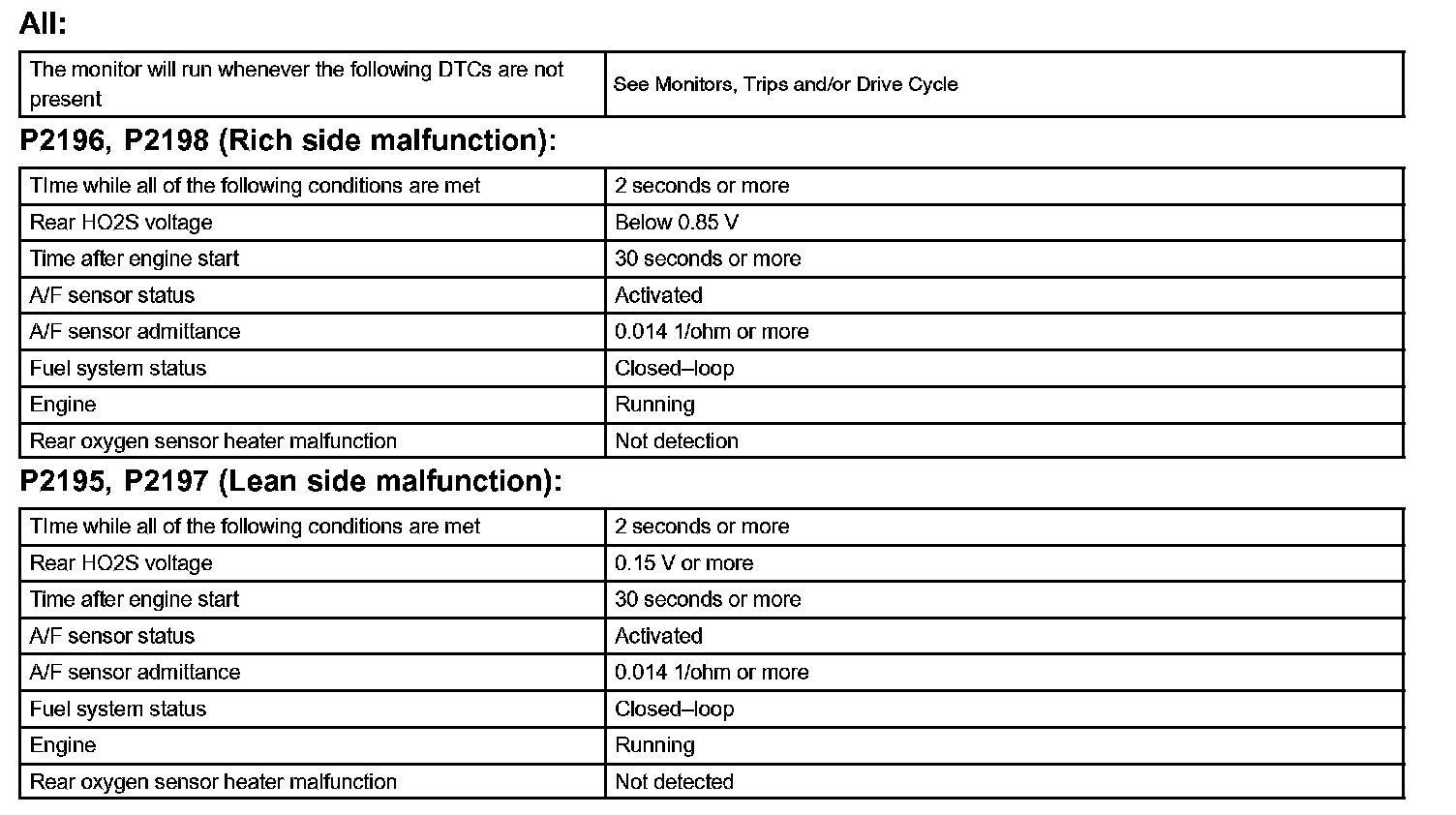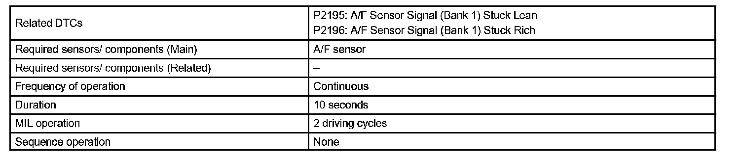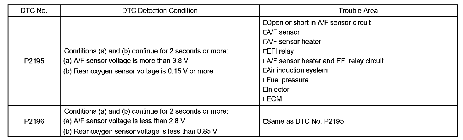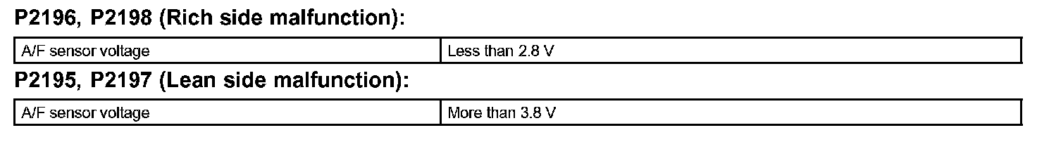 If the A/F sensor voltage output is less than 2.8 V (very RICH) for 10 seconds even though voltage output of the heated oxygen sensor output voltage is less than 0.85 V, the ECM sets DTC P2196 or DTC P2198. If the heated oxygen sensor output voltage is 0.15 V or more but the A/F sensor voltage output is more than 3.8 V (very LEAN) for 10 seconds, DTC P2195 is set.