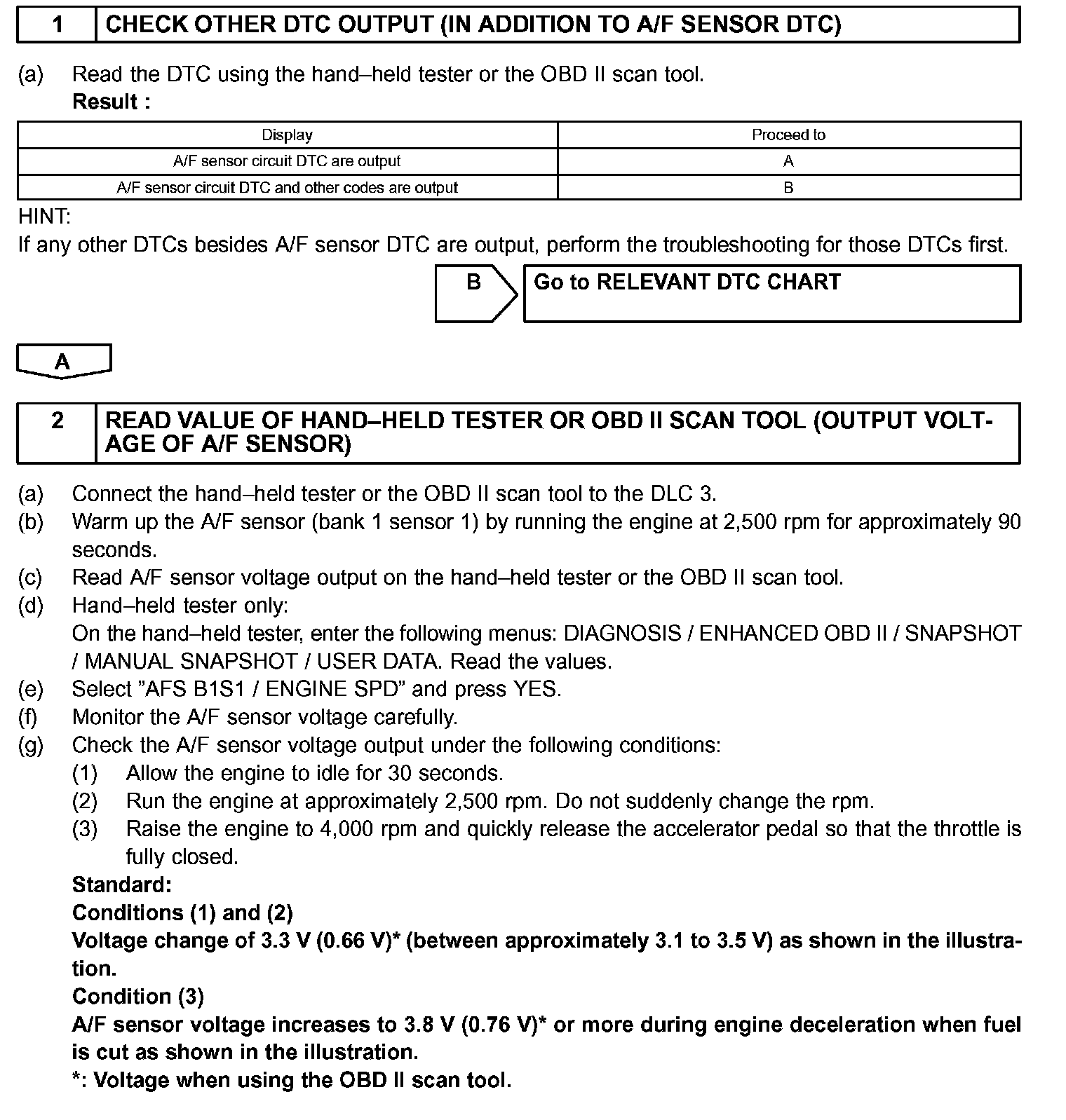 - The OBD II scan tool (excluding hand-held tester) displays one fifth of the A/F sensor output voltage which is displayed on the hand-held tester.