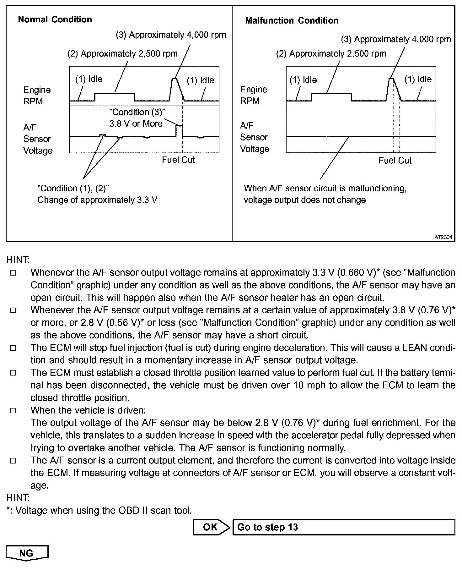 The following A/F CONTROL procedure enables the technician to check and graph the voltage outputs of both the A/F sensor and the heated oxygen sensor.