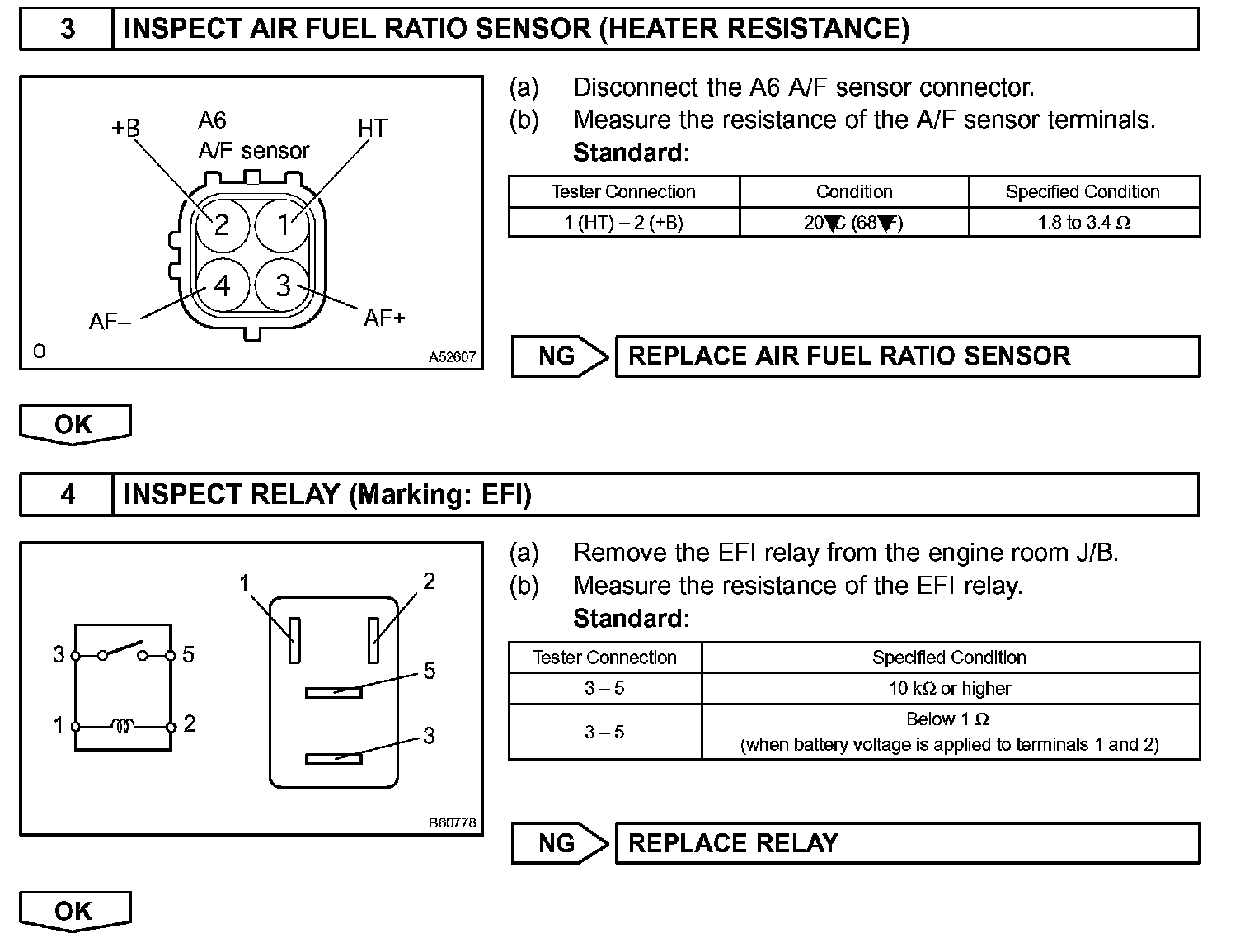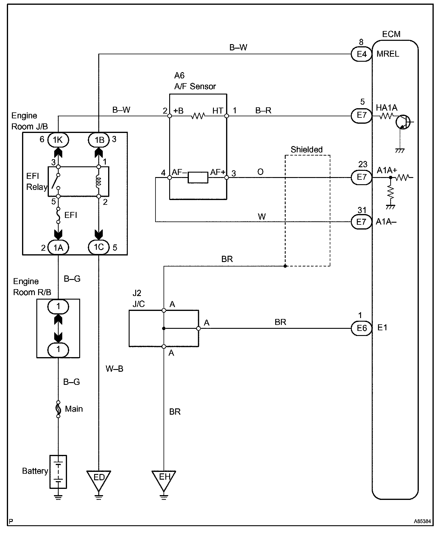- The ECM controls the voltage of the A1A+, A1A- terminals of the ECM to a fixed voltage. Therefore, it is impossible to confirm the A/F sensor output voltage without the OBD II scan tool or the hand-held tester.