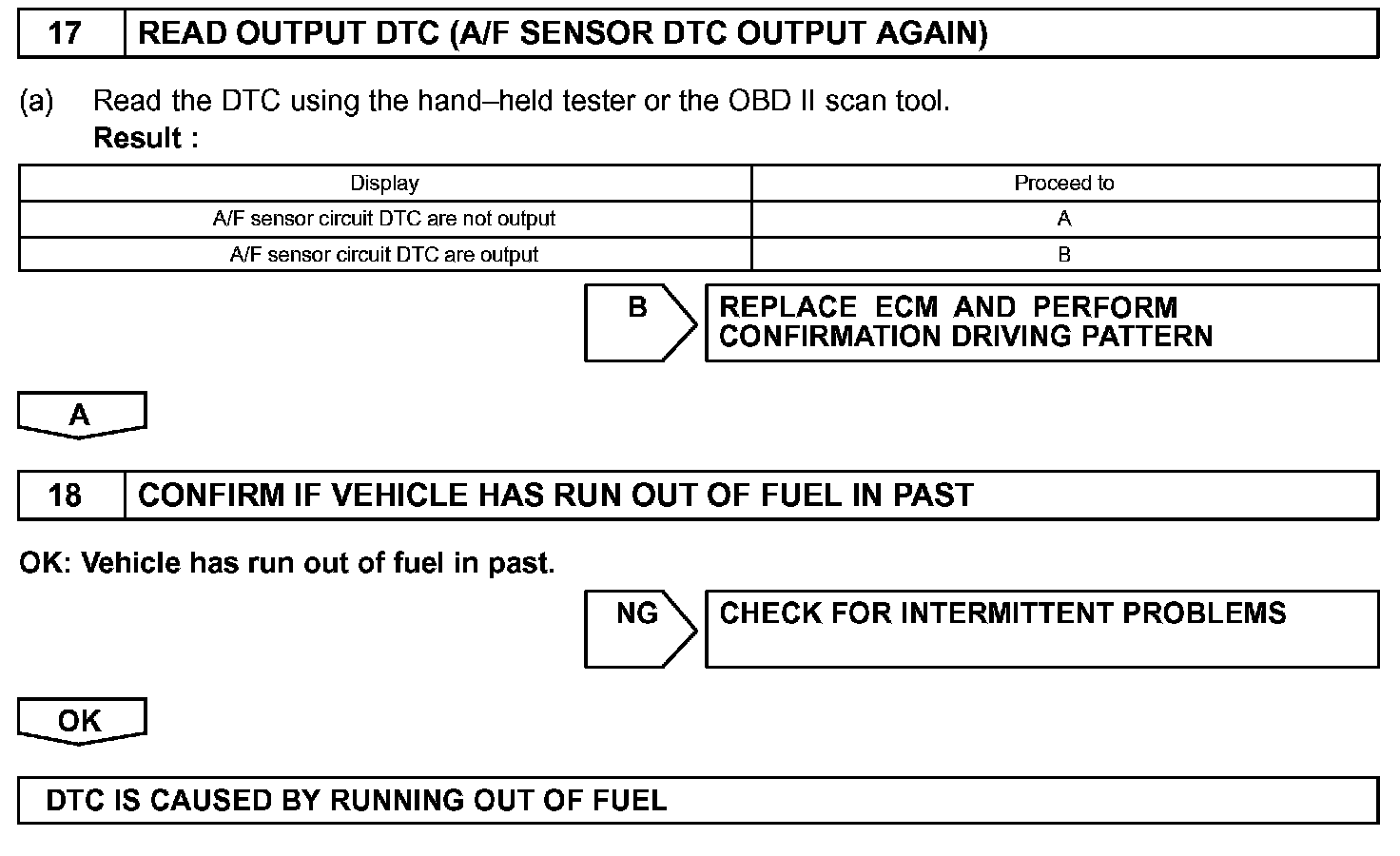 It is possible the malfunctioning area can be found using the ACTIVE TEST A/F CONTROL operation. The A/F CONTROL operation can determine if the A/F sensor, heated oxygen sensor or other potential trouble areas are malfunctioning or not.