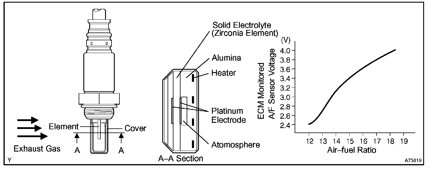 The A/F sensor is equipped with a heater which heats the zirconia element. The heater is also controlled by the ECM. When the intake air volume is low (the temperature of the exhaust gas is low), current flows to the heater to heat the sensor to facilitate detection of accurate oxygen concentration.