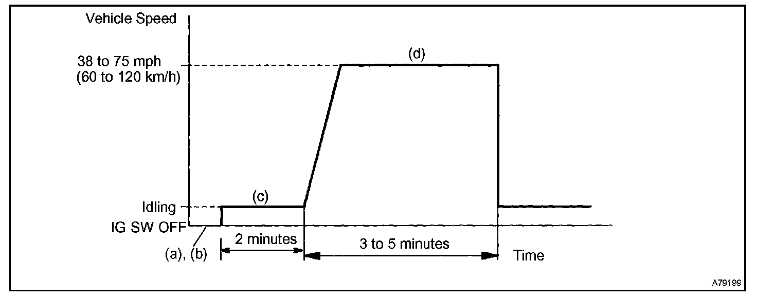d. Drive the vehicle at 60 to 120 km/h (38 to 75 mph) and engine speed at 1,400 to 3,200 rpm for 3 to 5 minutes.