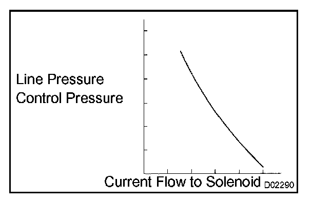 The linear solenoid valve (SLT) controls the transmission line pressure for smooth transmission operation based on signals from the throttle position sensor and the vehicle speed sensor. The ECM adjusts the duty cycle of the SLT solenoid valve to control hydraulic line pressure coming from the primary regulator valve. Appropriate line pressure assures smooth shifting with varying engine outputs.
