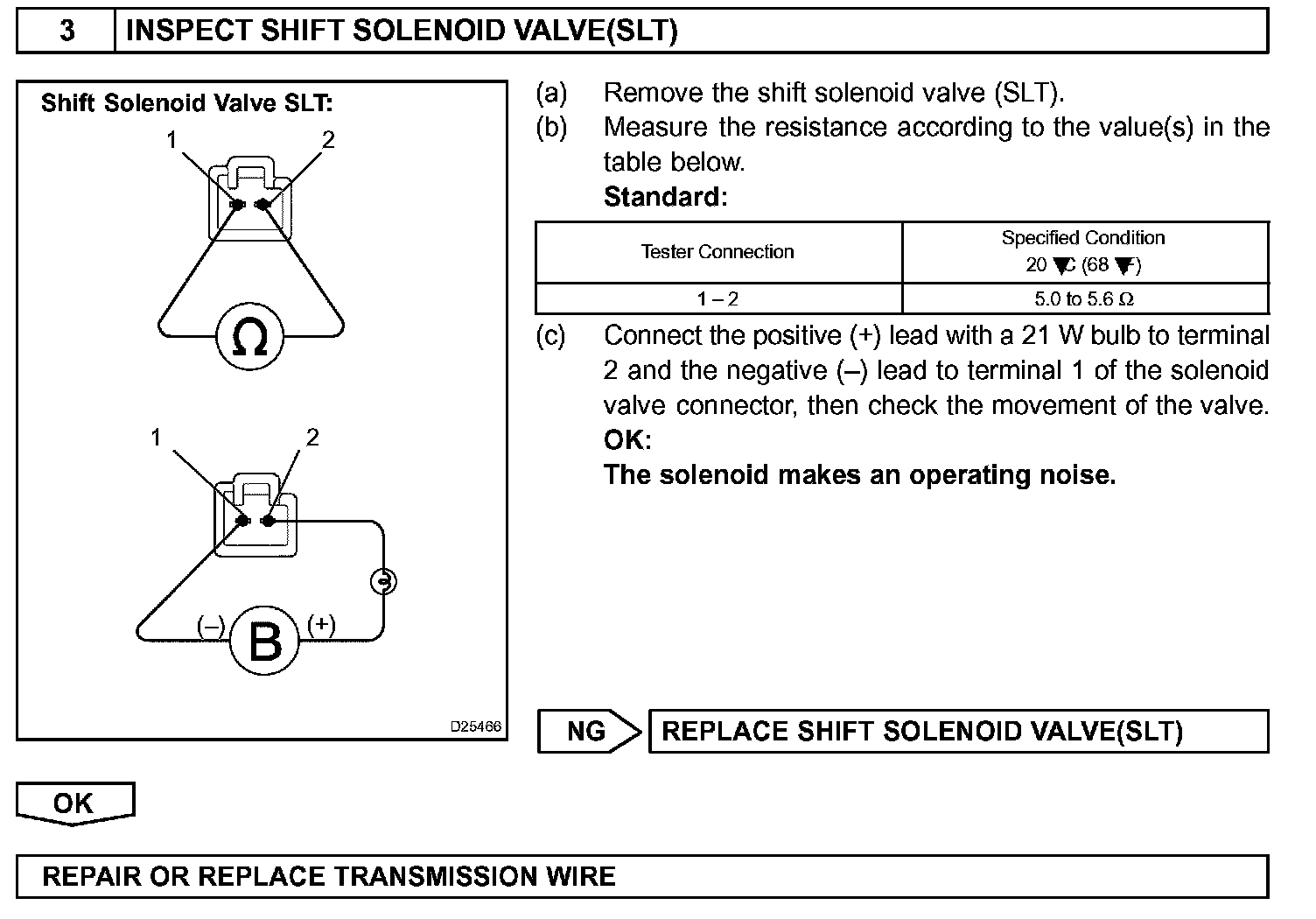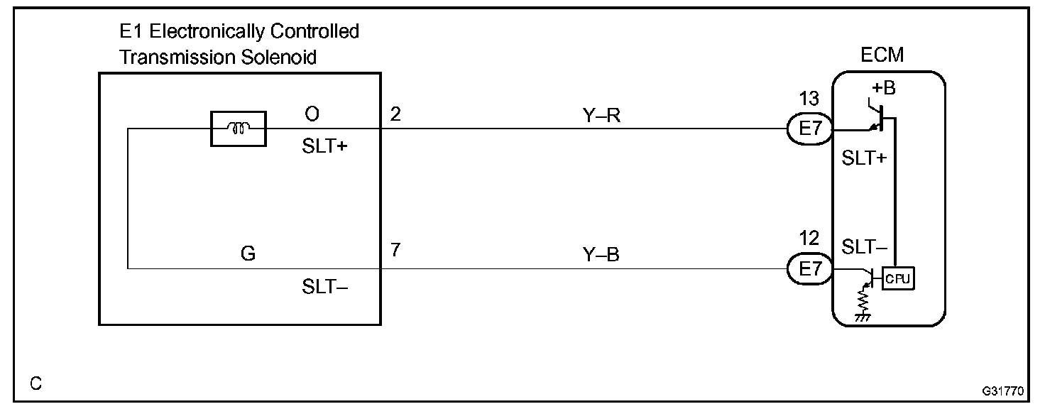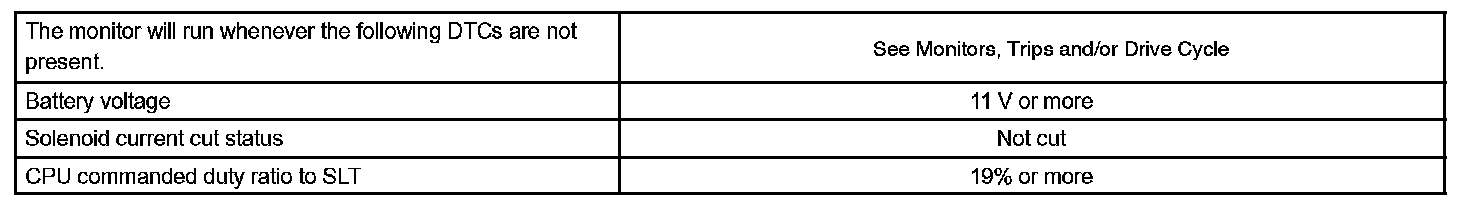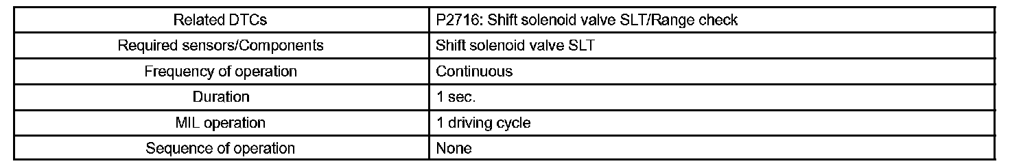 When an open or short in the linear solenoid valve (SLT) circuit is detected, the ECM interprets this as a fault. The ECM will turn ON the MIL and store the DTC.