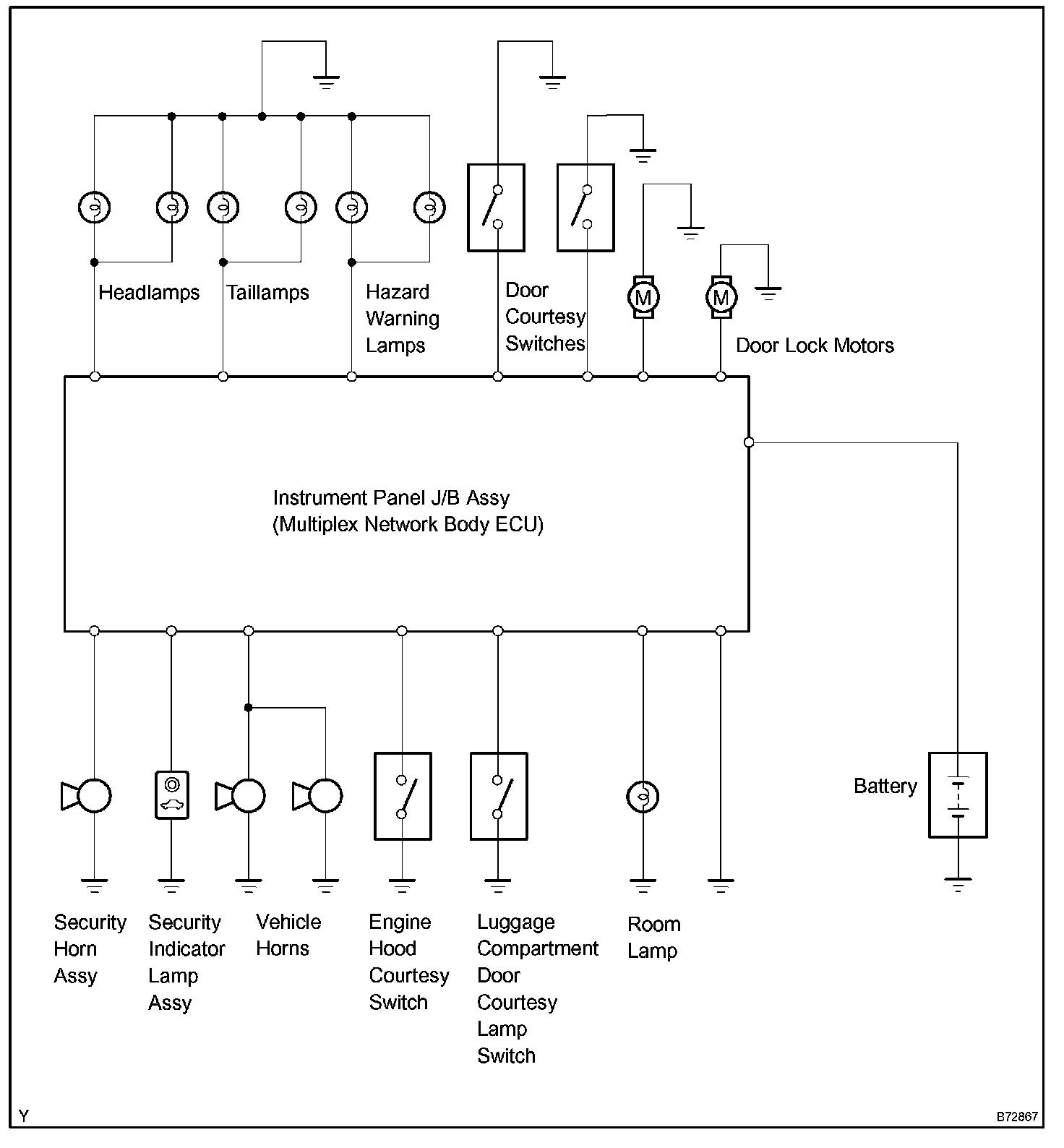 The theft deterrent system is designed to deter break-in and theft. If an attempted break-in or theft is detected, the vehicle horns and security horn will sound; room lamps will turn on; and hazard warning lamps, taillamps and headlamps will flash continuously. The system uses the following cues to detect an attempted break-in or theft: 1) vehicle is forcibly entered, 2) engine hood is forcibly opened, 3) doors are unlocked without the use of a key, or 4) the battery terminals are disconnected and then reconnected.