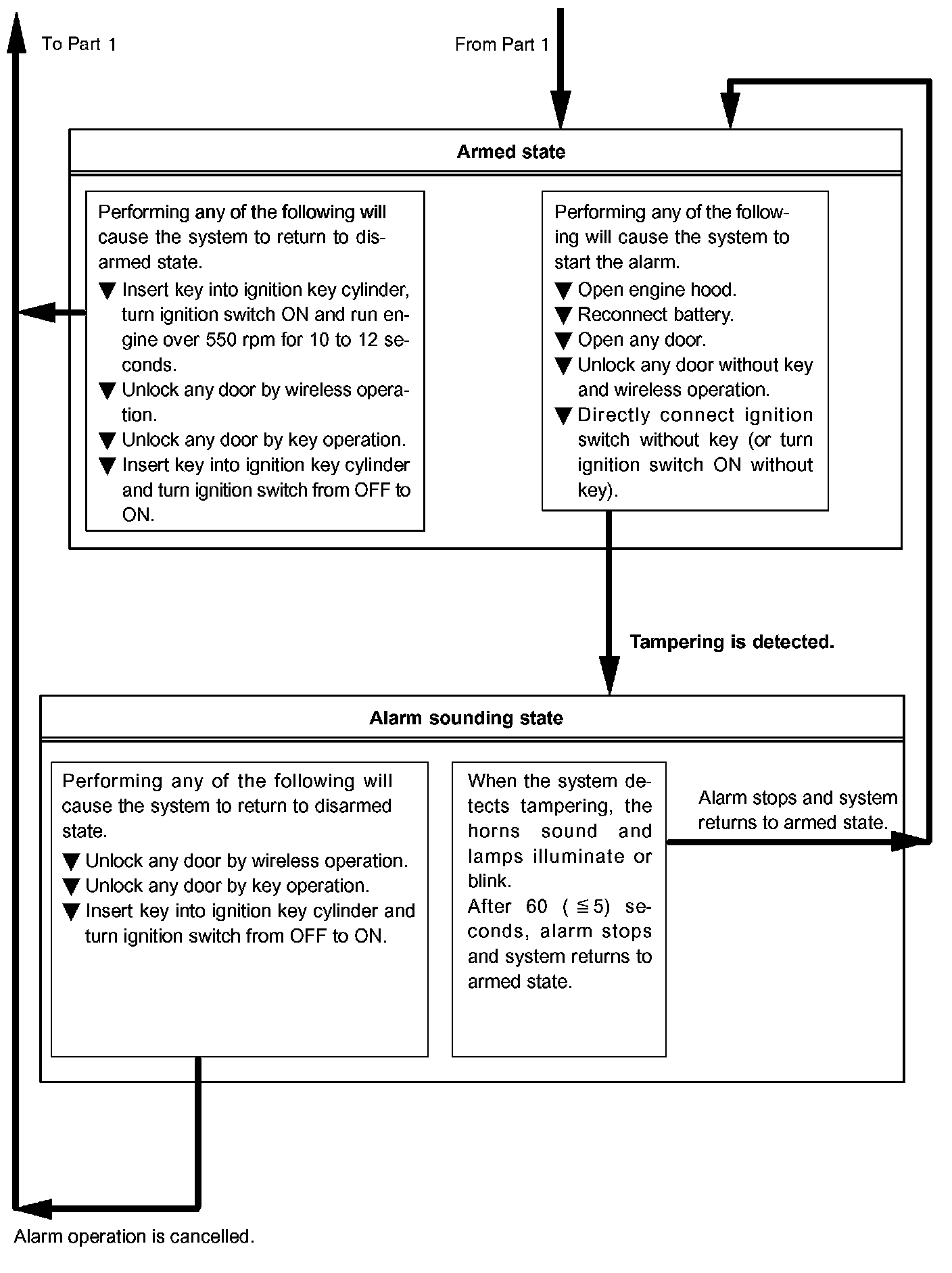When the theft deterrent system has entered into the alarm sounding state (tampering has been detected) even once, the taillamps will illuminate for 2 seconds if any of the following conditions is fulfilled.