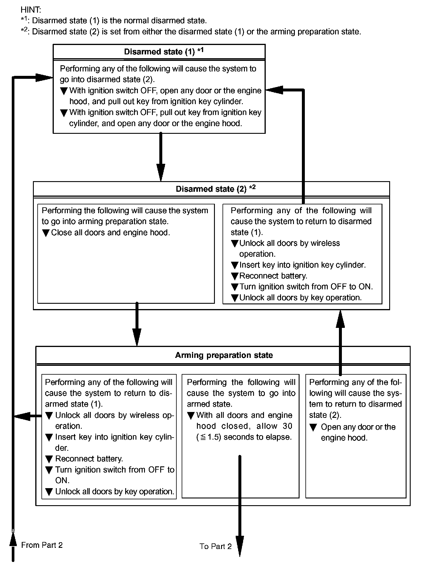 HINT: If, during the alarm sounding state, a door is unlocked and no key is in the ignition key cylinder, a forced door lock signal will be output (see step 5).