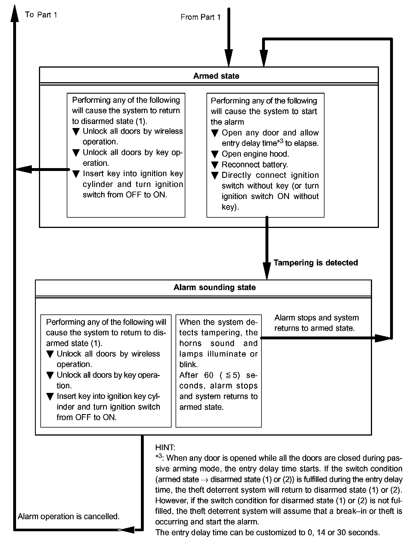 - When the theft deterrent system detects that the doors are opened during passive arming mode, the alarm is not set off immediately depending on the entry delay time setting.