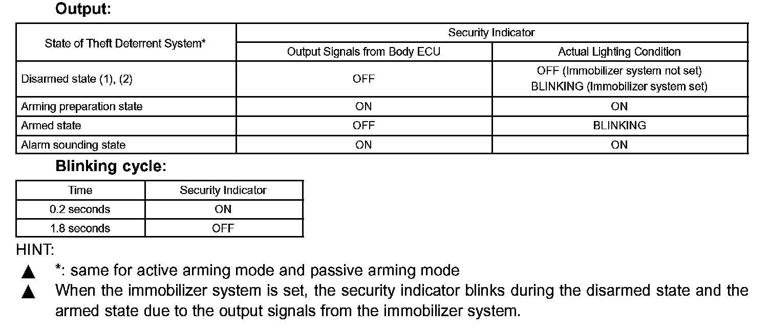 a. The security indicator turns on and off based on output signals from the multiplex network body ECU. However, in some cases the actual status of the security indicator is different from the output signals of the multiplex network body ECU.