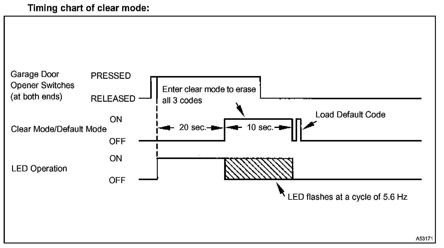1. Press and hold the left and right switches of the garage door opener for 20 seconds. The LED will begin to flash at a cycle of 5.6 Hz. Releasing the switches will end clear mode.