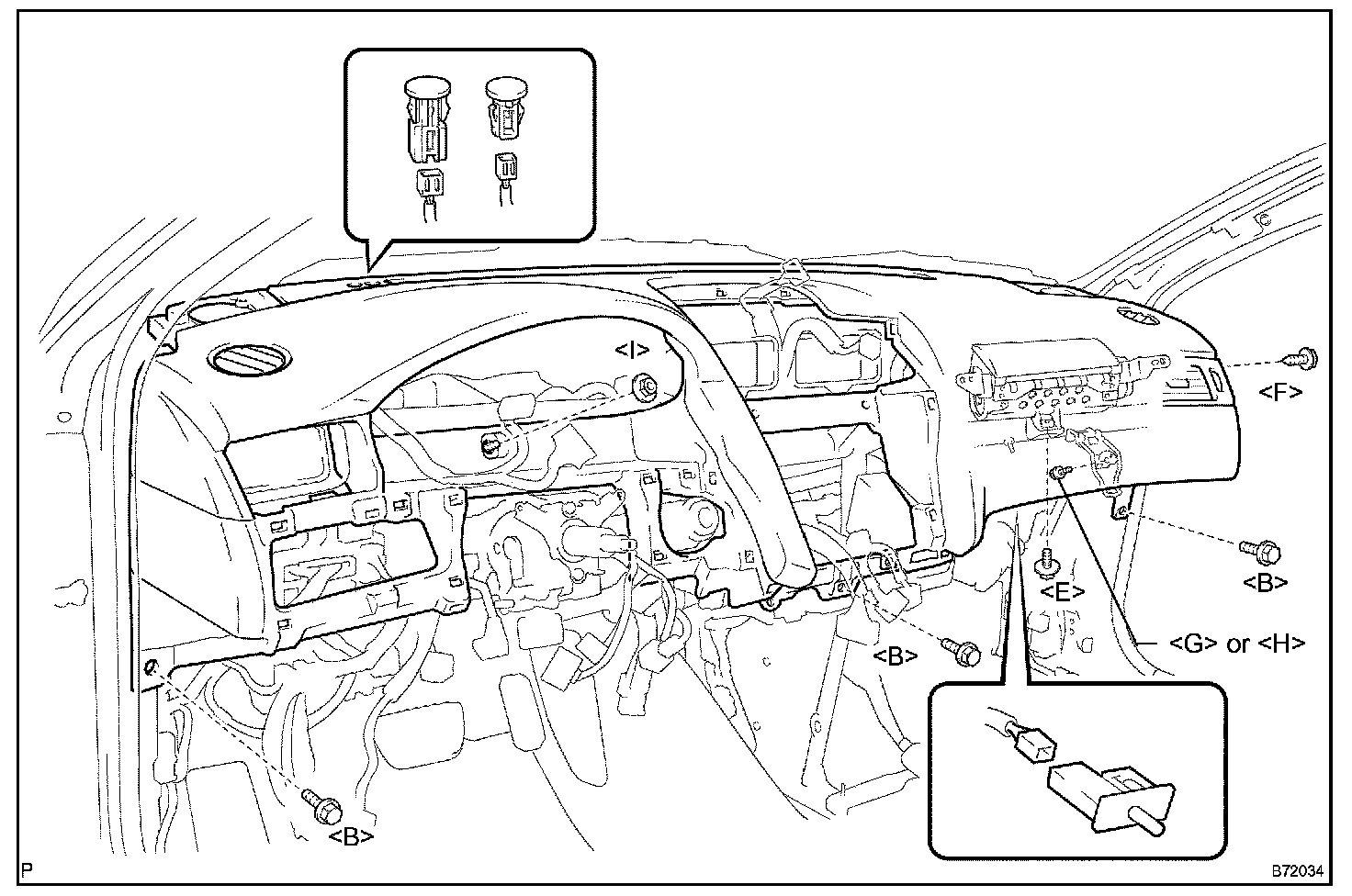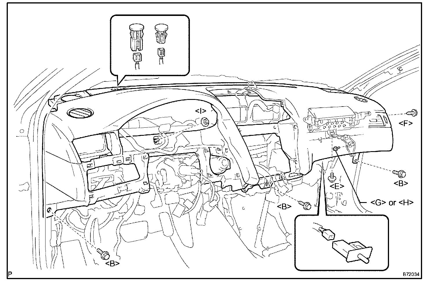 HINT: The bolts, screws and nuts necessary for installation and removal of the instrument panel are illustrated and alphabetically coded.