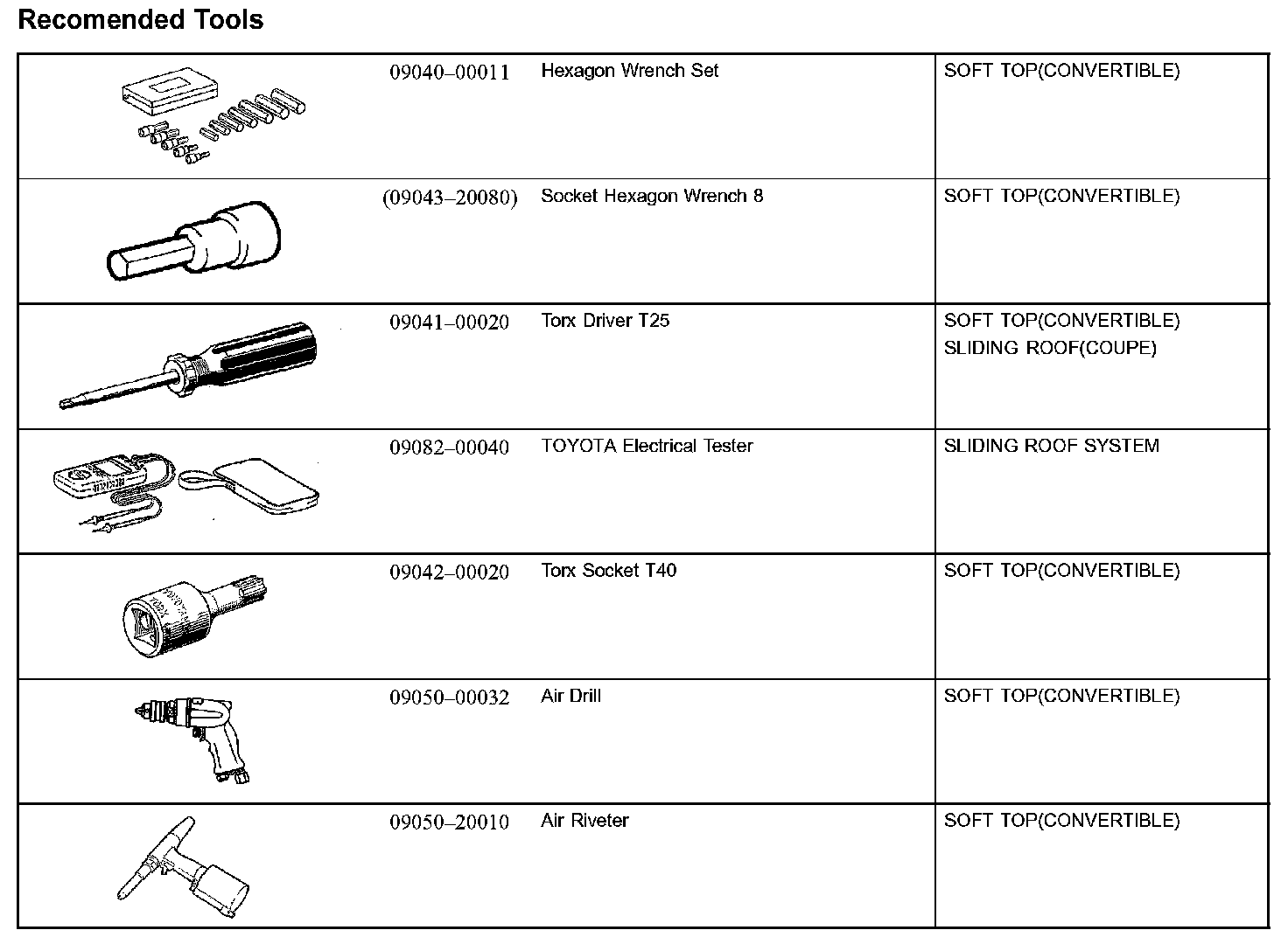 Sliding Roof/Convertible - Recommended Tools: