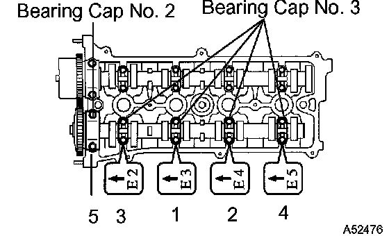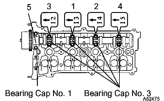 ^ Tighten the bolts after adjusting the position for the thrust direction of the camshaft by the bearing cap No. 1.