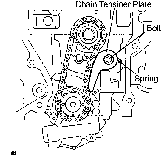 f) Insert the damper spring into the adjusting hole, and install the chain tensioner plate with the bolt.