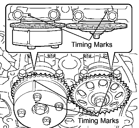 1) Align the timing marks of the camshaft timing gear/sprocket and bearing caps (No. 1 and No. 2).