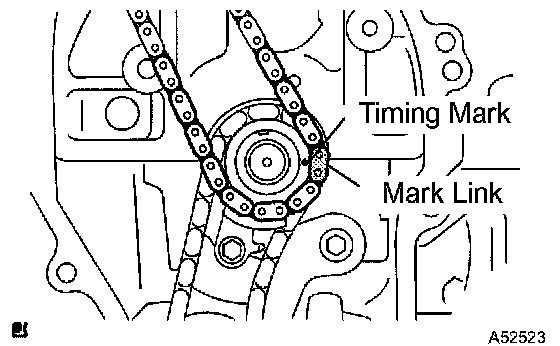 d) Align the mark links (gold or yellow colored links) with the timing marks of the camshaft timing gear and camshaft timing sprocket, and install the chain.