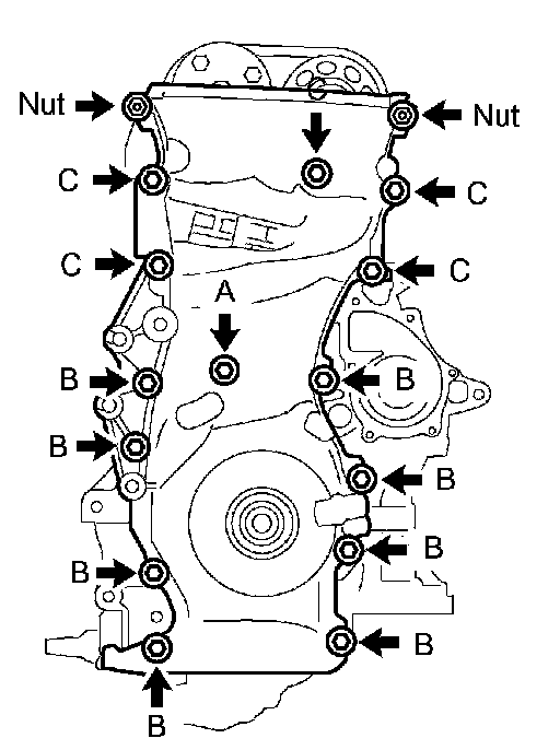 d) Install the timing chain cover with the 14 bolts and 2 nuts.