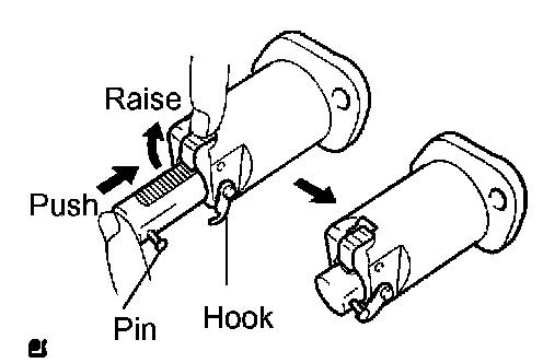 a) Raise the ratchet pawl, fully push in the plunger and apply the hook to the pin so that the plunger cannot spring out.